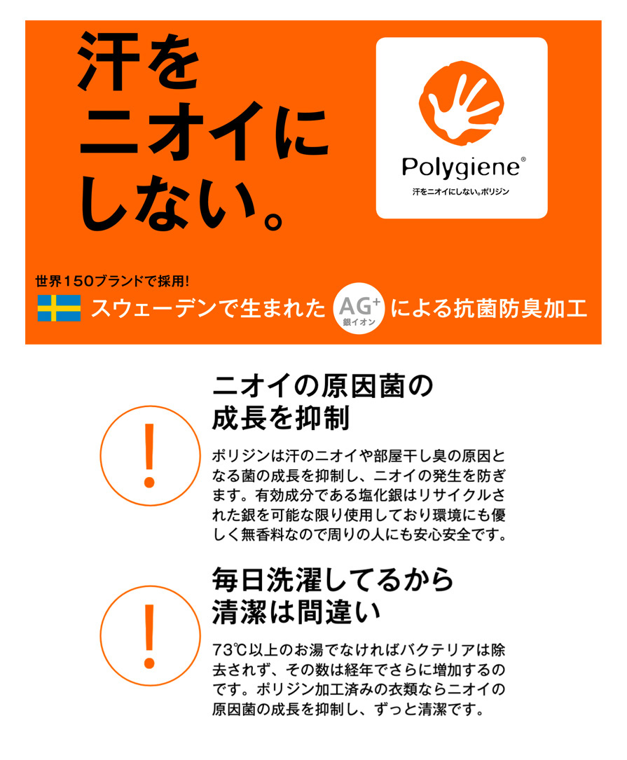 ポリジン加工…スウェーデン発の銀イオンによる抗菌防臭加工。原因菌の成長を抑制し、においの発生を防ぐ。有効成分の塩化銀はリサイクルされた銀を使用。環境にやさしく無香料なので周りの人にも安心です。