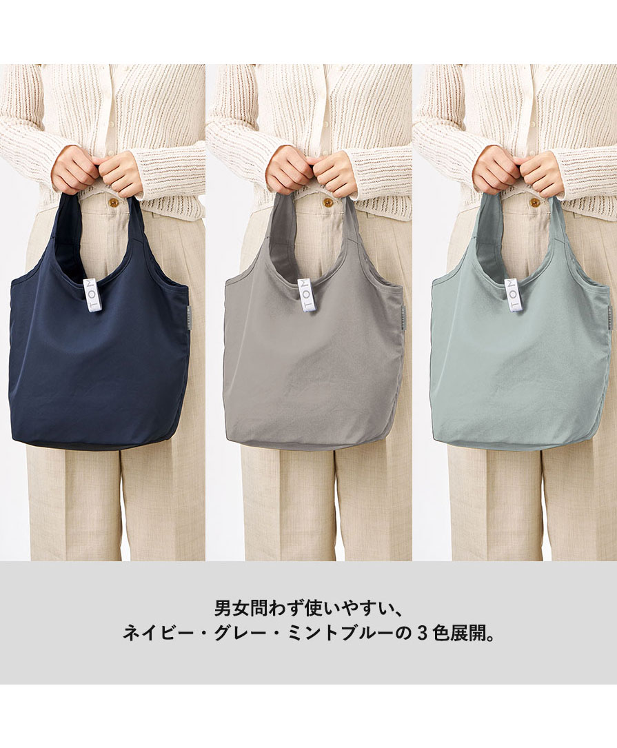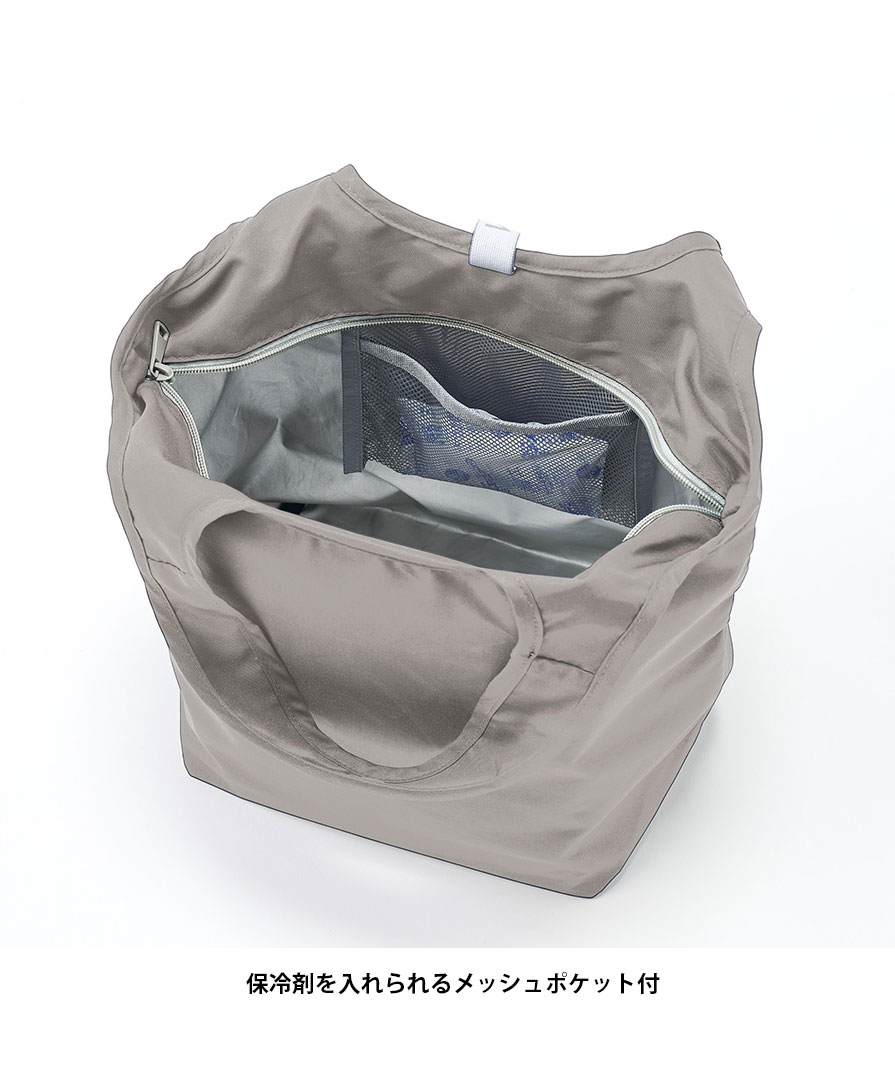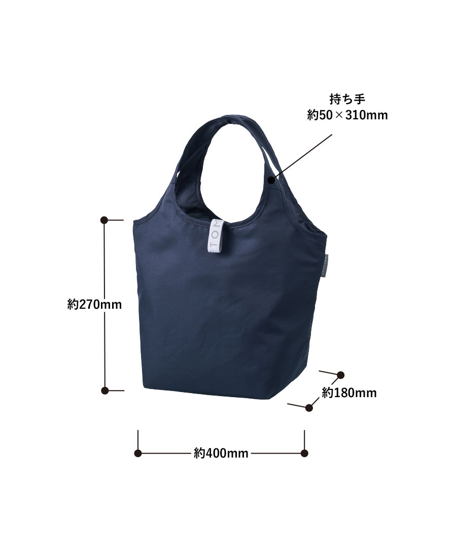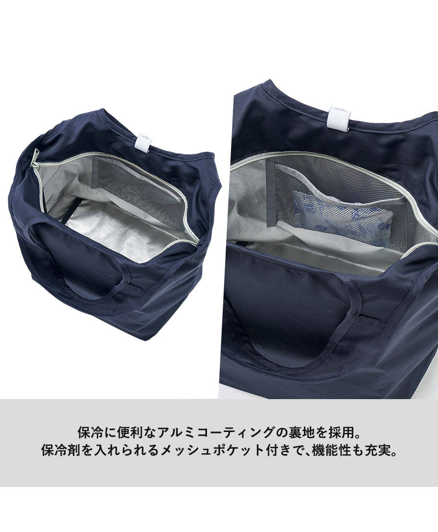 内側にはアルミコーティングと保冷剤用メッシュポケット付きで、冷たい飲み物や生鮮食品も安心して持ち運べます。底マチには芯材が入っているためしっかり自立し、食材も詰めやすく見た目もスマート。ネイビー、グレー、ミントブルーの無地カラー展開は男女問わず使いやすく、ノベルティや記念品にも映えるデザインです。