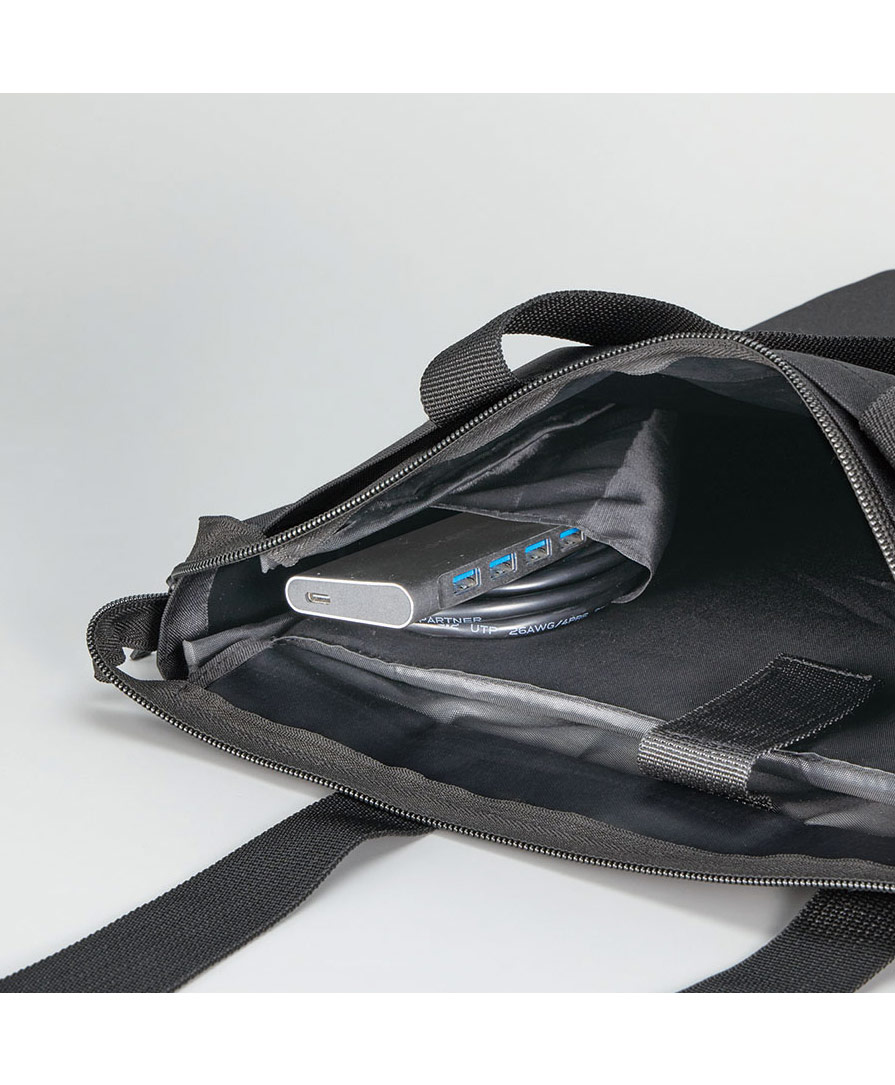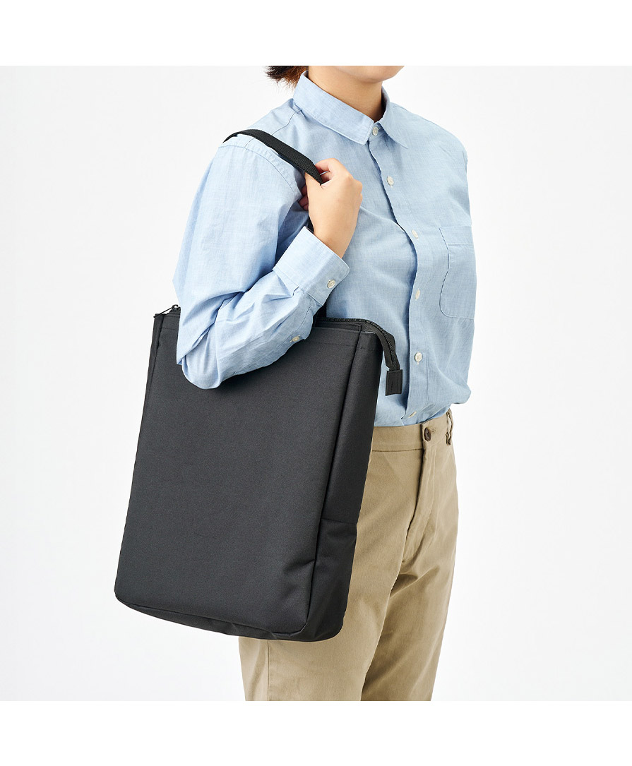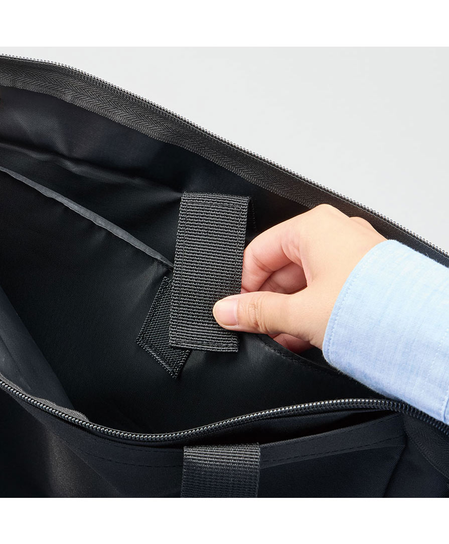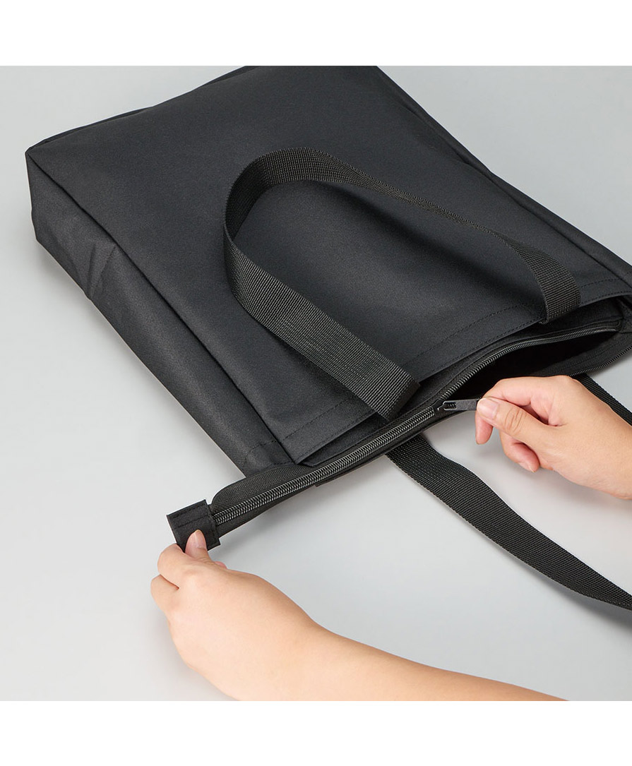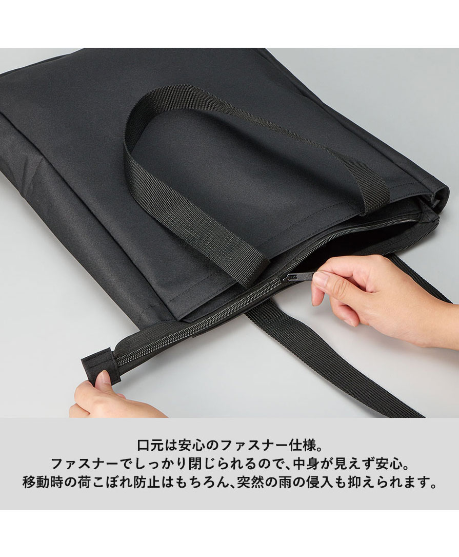 内側ポケットと背面部分にはウレタン入り仕様を採用。ノートPCバッグとして気になる衝撃をやわらかく受け止め、PCへの負担を軽減します。ポケットにはベルクロ付きで、収納物をピタッと固定できるのも安心ポイント。さらにファスナートート構造のため、中身が見えにくく、雨や外気から守れるのも実用的です。PCバッグトートとしてはもちろん、テレワークバッグや営業用バッグ、書類収納バッグとしても活躍します。