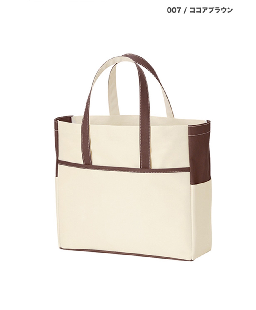 スタイリッシュな2トーンデザインが魅力のコンビカラートート。シンプルながら洗練されたカラーバリエーションで、普段使いはもちろん、ショップのオリジナルグッズやノベルティとしても大人気!大きめの外ポケットと便利なサイドポケット付きで、小物をすっきり収納でき、使い勝手も抜群です。