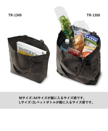M・Lの2サイズ展開で、MサイズはA4サイズを縦にいれることができる程よいサイズ感、日頃のお買い物バッグや通勤・通学のサブバッグとして便利です。Lサイズは2Lペットボトルを縦に入れても余裕のあるサイズ感、週末のお買い物などにも活躍します。