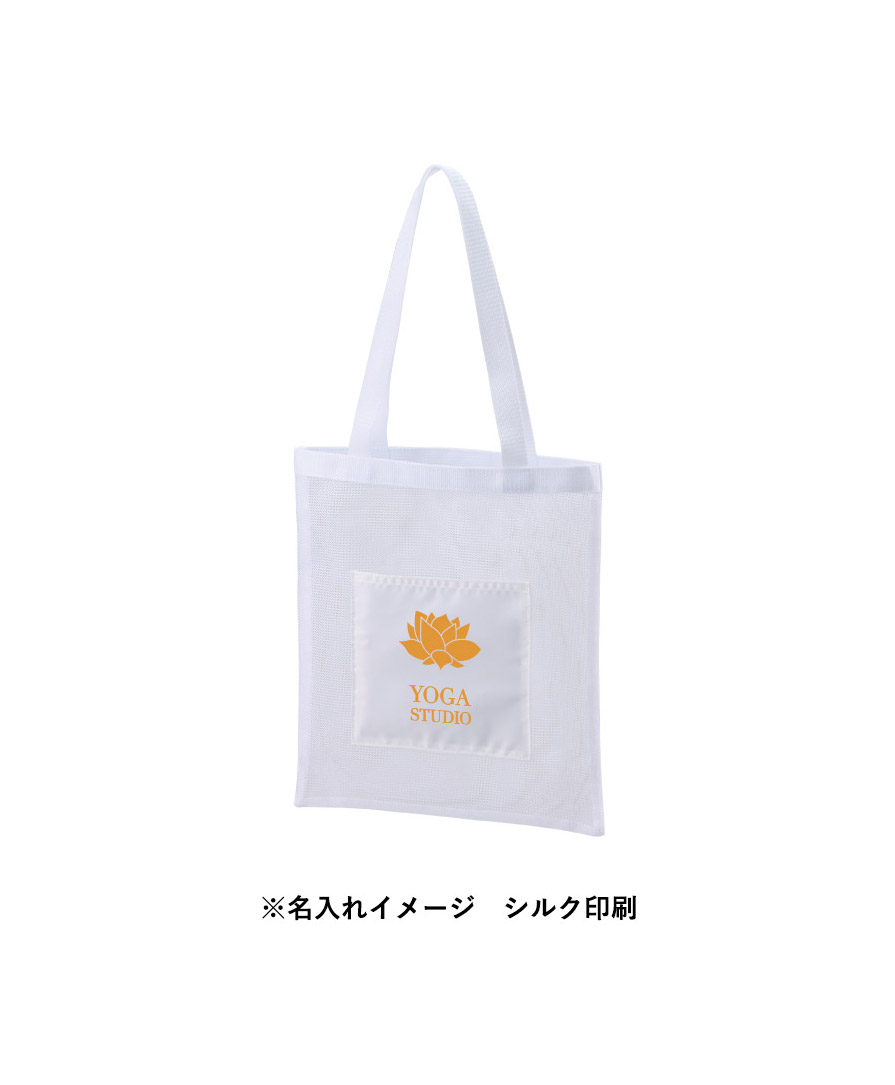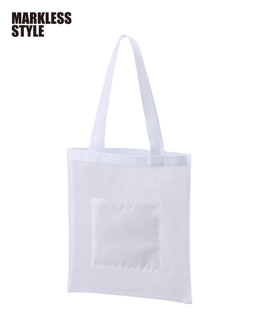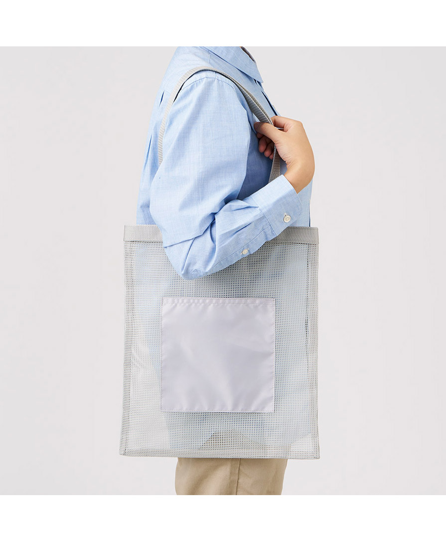 透け感がおしゃれな軽量フラットトート。シーズンレスに活躍するメッシュトートバッグは、書類がすっきり収まるA4対応サイズ。イベントや説明会で配布する展示会ノベルティ、企業ノベルティとしても抜群の使いやすさ。目を惹くフロントポケットは、スマホや小物収納にちょうどよく、デザインのアクセントとしても◎。