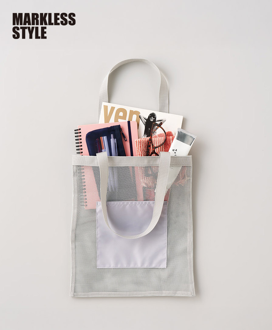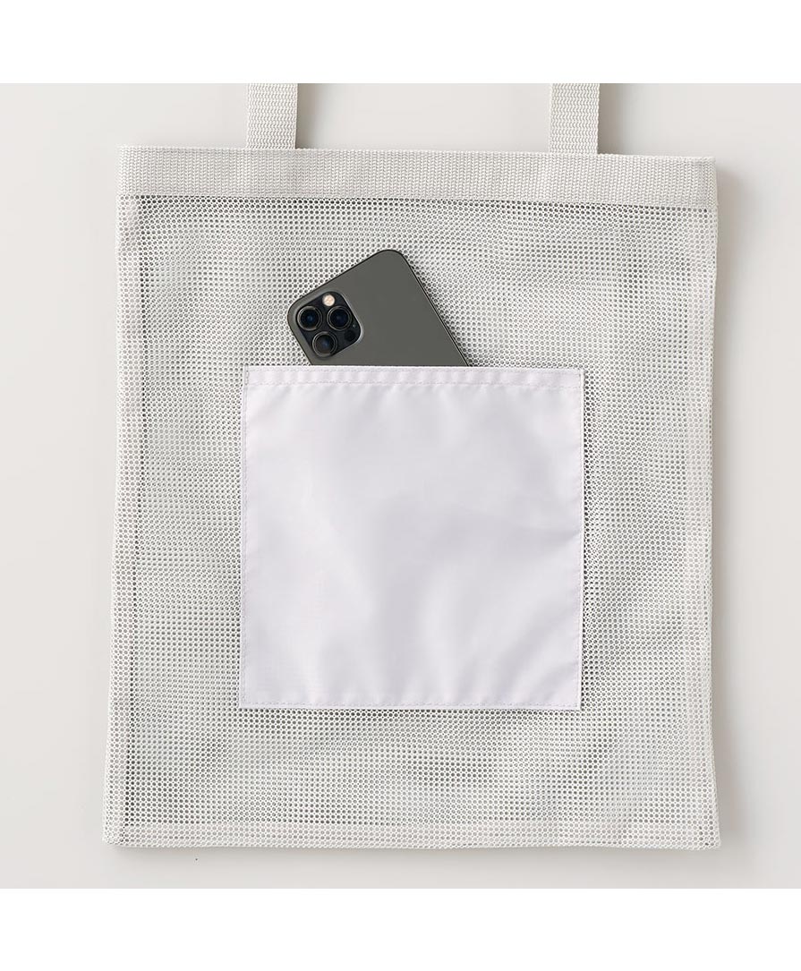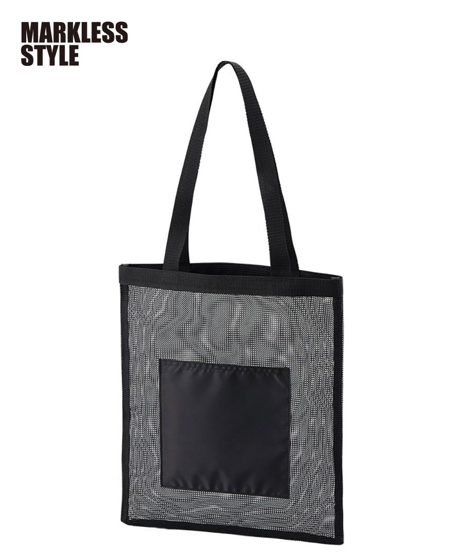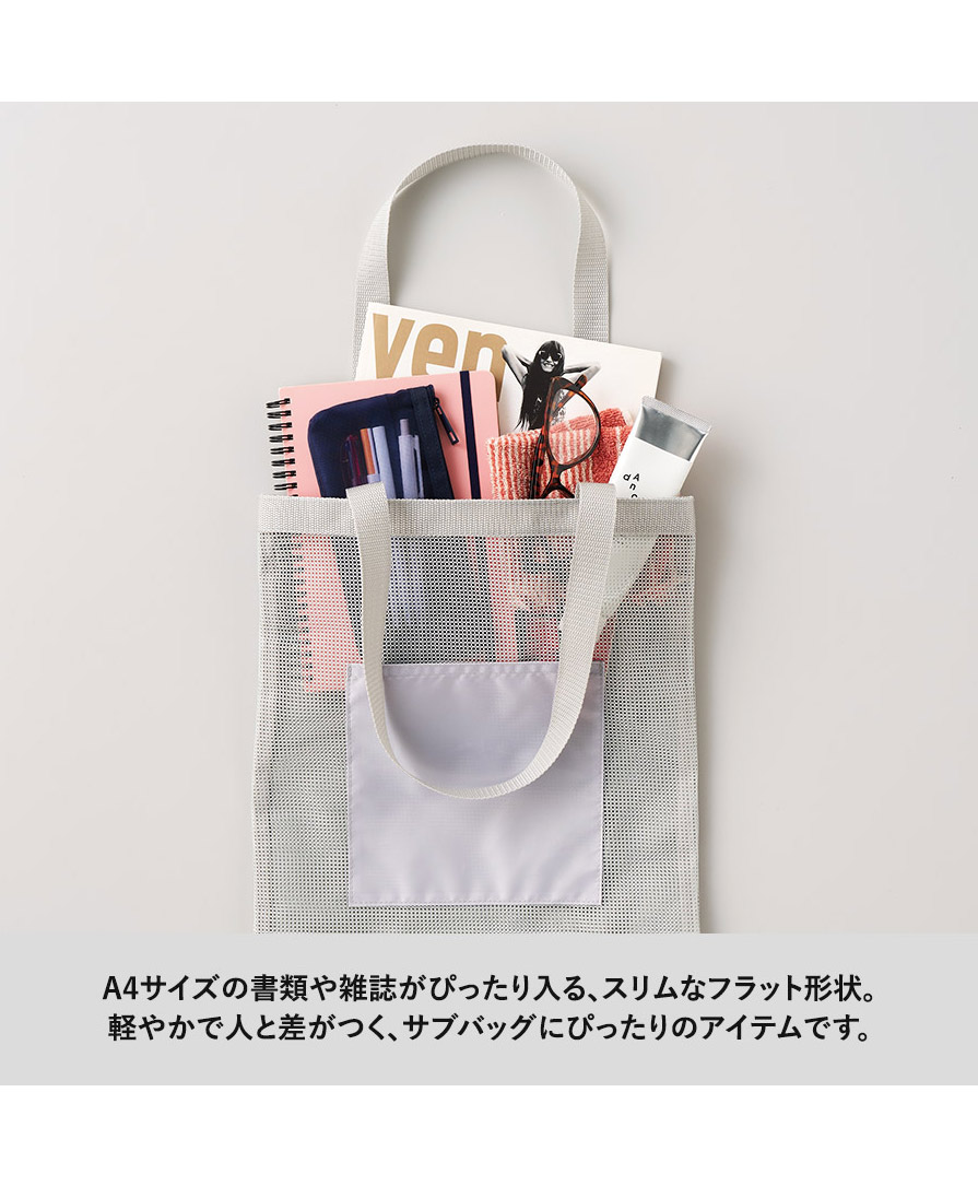透け感がおしゃれな軽量フラットトート。シーズンレスに活躍するメッシュトートバッグは、書類がすっきり収まるA4対応サイズ。イベントや説明会で配布する展示会ノベルティ、企業ノベルティとしても抜群の使いやすさ。目を惹くフロントポケットは、スマホや小物収納にちょうどよく、デザインのアクセントとしても◎。