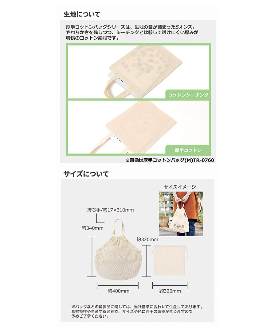 布地は5オンスの柔らかくしなやかなコットン素材を採用し、日用品や食材を持ち運べる耐久性と収納力を兼ね備えています。大きなロゴやブランド名を網目からチラ見せすることで、スタイリッシュな印象を演出。シンプルで洗練されたデザインは、普段使いからイベント用ノベルティまで幅広い用途で活躍します。