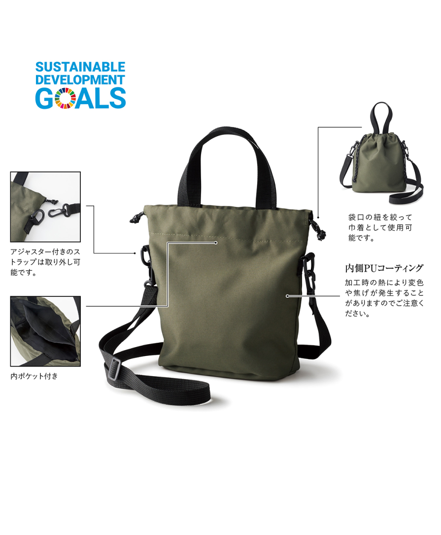 リサイクルポリエステルを使用した、ショルダーと手持ちの2wayで使用できるミニバッグ。ストラップを取り外して、かわいい巾着ポーチとしても使用できます。