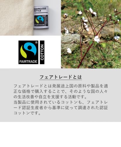 ▼フェアトレードとは?発展途上国の原料や製品を適正な価格で購入することで、そのような国の人々の生活改善や自治るを支援する活動です。 当製品に使用されているコットンも、フェアトレード認証生産者から基準に従って調達された認証コットンです。▼国際フェアトレード認証コットンラベルとは?国際フェアトレード認証ラベルは、その原料が生産されてから、輸出入、加工、製造工程を経て「国際フェアトレード認証製品」として完成品となるまでの各工程で、国際フェアトレードラベル機構(Fairtrade International)が定めた国際フェアトレード基準が守られていることを証明するラベルです。 つまり、この商品はフェアトレードだという証明書や目印のような役割をしています。フェアトレードの取り組みについてはこちら出典:フェアトレードジャパン
