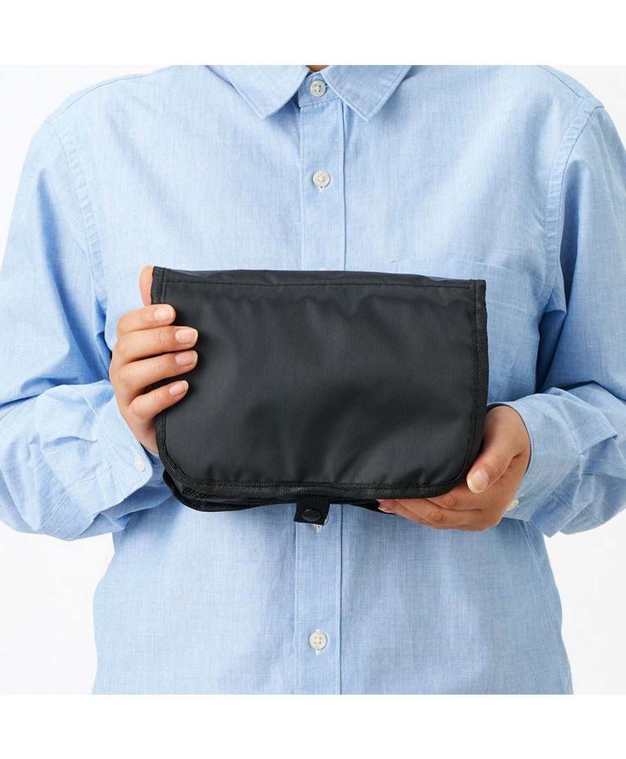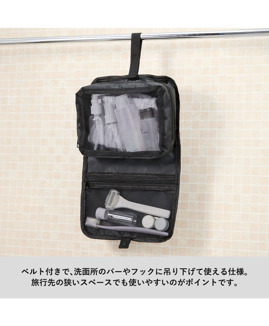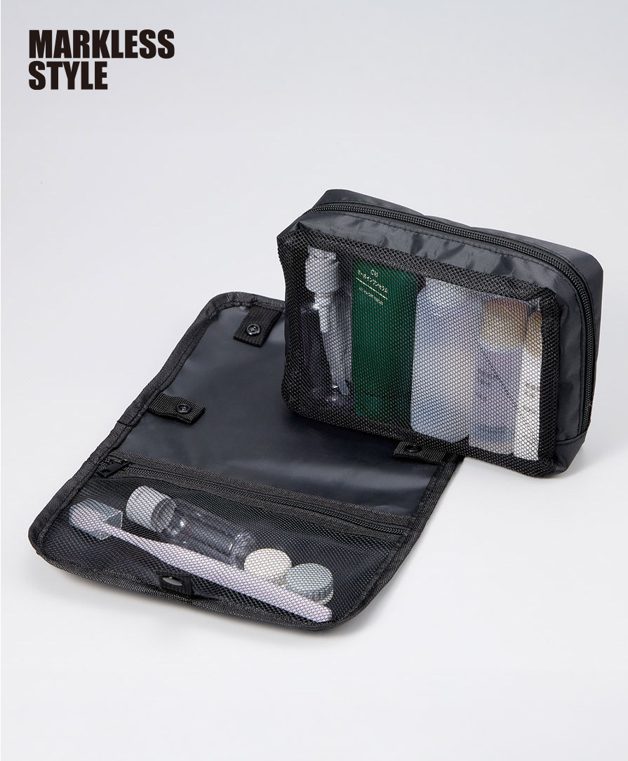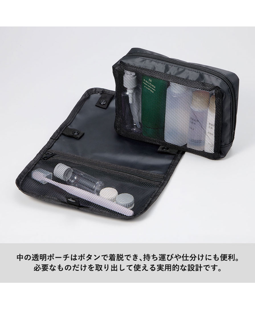 メッシュポーチ仕様のため通気性が良く、洗面用ポーチやアメニティポーチとしても扱いやすい仕上がりです。ポーチ部分は取り外し可能で、用途に応じて仕分けポーチとして単体使いもOK。コンパクトポーチながら整理力が高く、出張用ポーチとしても頼れる存在です。