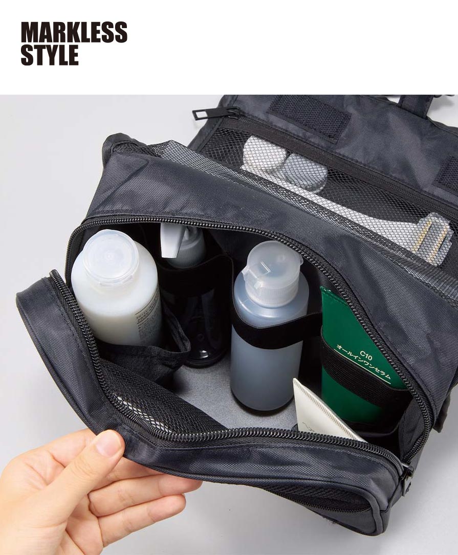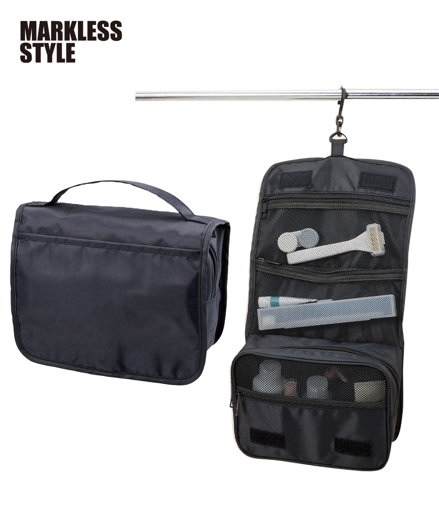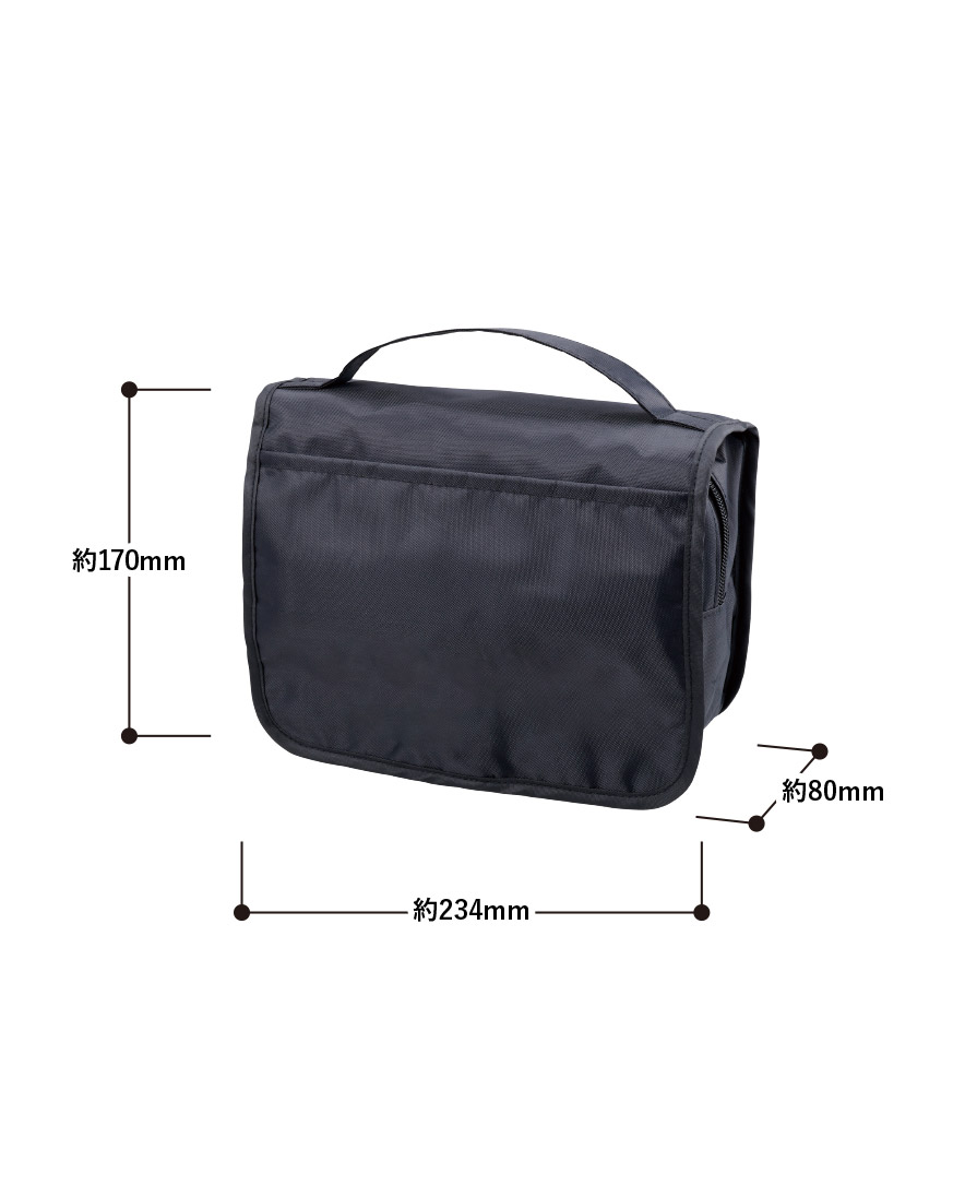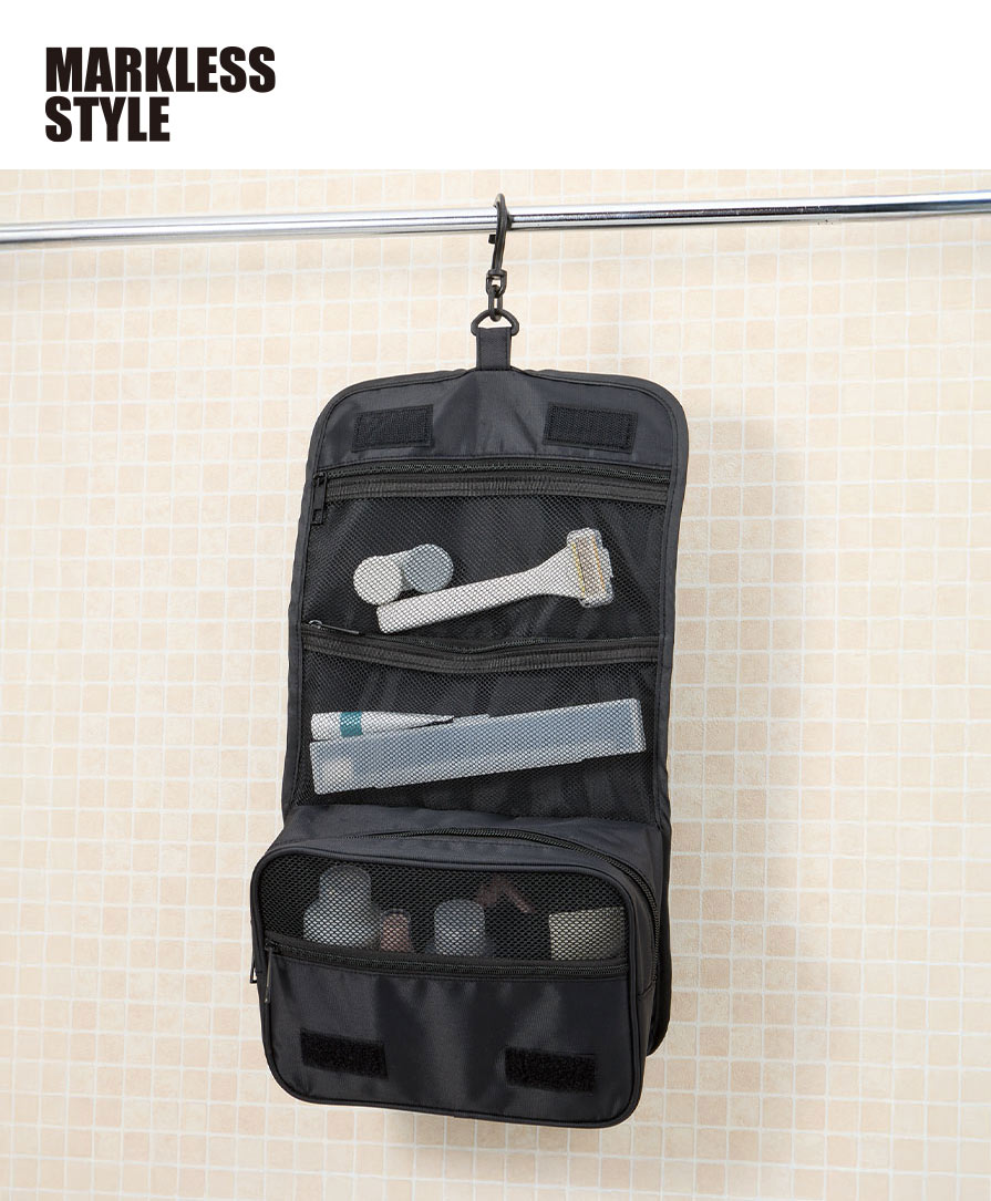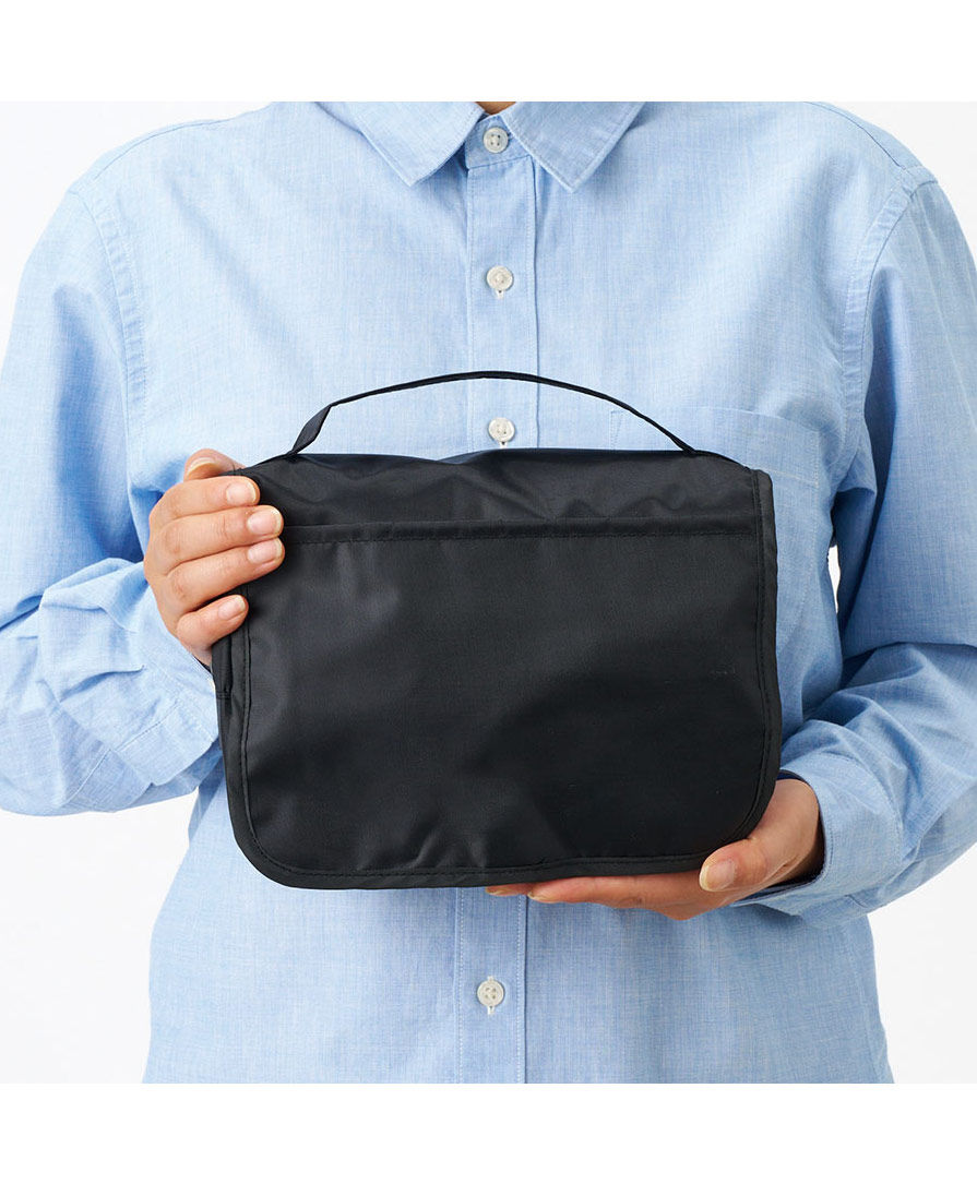 旅先でも洗面台まわりをスマートに整える、3段式のハンギングポーチ。広げて吊り下げるだけで中身が一目で確認でき、洗面用具ポーチや化粧ポーチとしての使い勝手をとことん追求した設計です。化粧品ボトルが立てたまま収まる余裕のあるサイズ感で、旅行用ポーチとしてはもちろん、出張用ポーチや長期滞在にも頼れる存在。