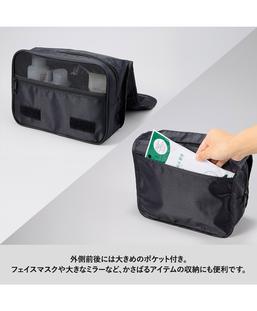 上部にはメッシュポケットを2つ、下部には独立したメッシュポーチを配置し、仕切り付きポーチならではの高い整理力を発揮します。底板や固定ベルトも備えているため、大容量ポーチでも中で崩れにくく、すっきり収納が可能。前後に付いた外ポケットは、マスクやミラー、小物類の一時収納に便利です。
