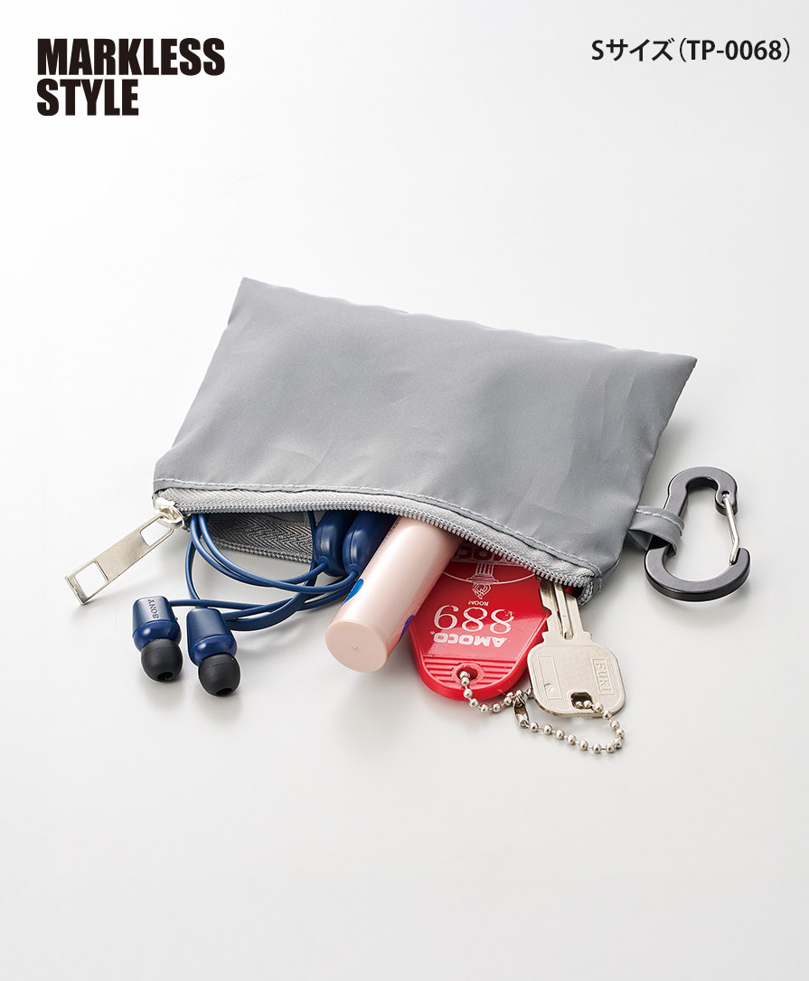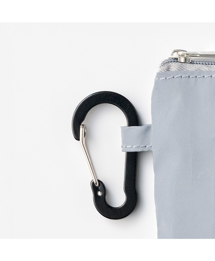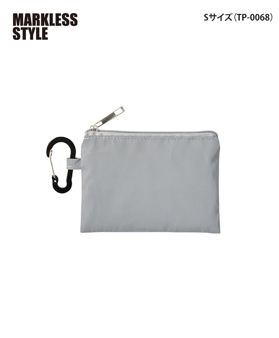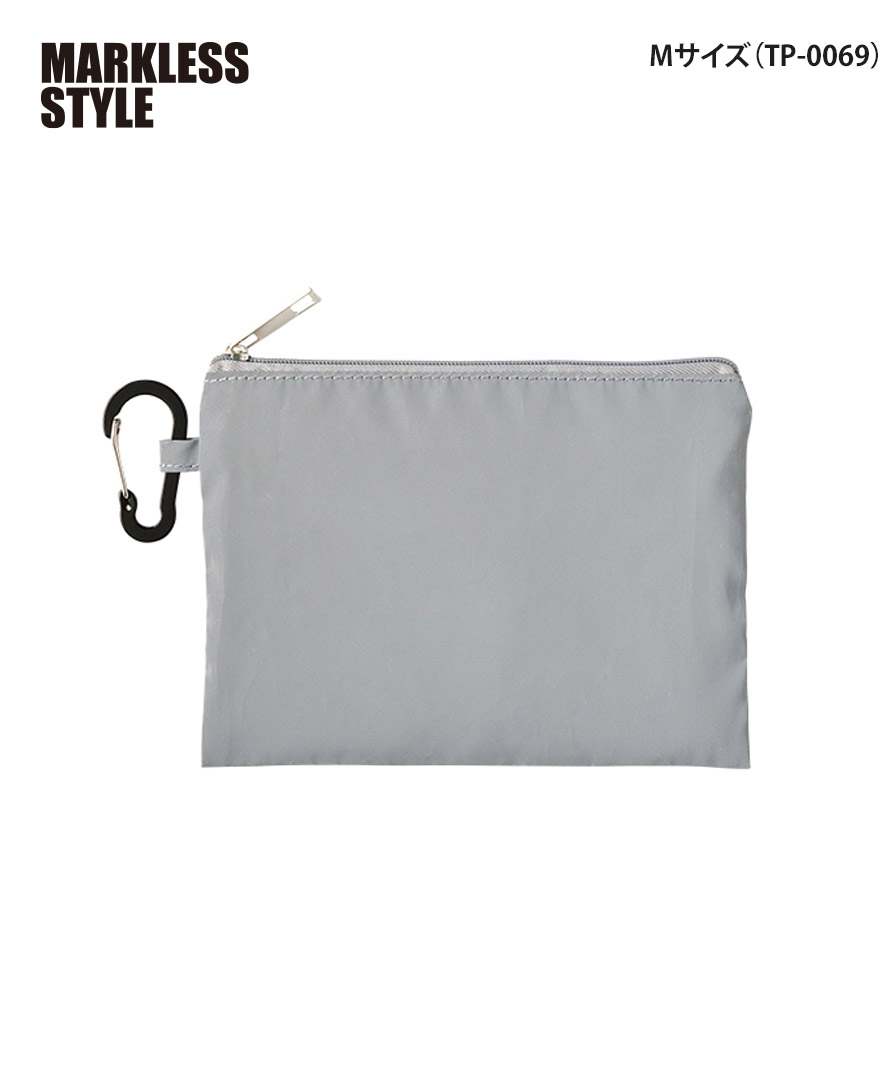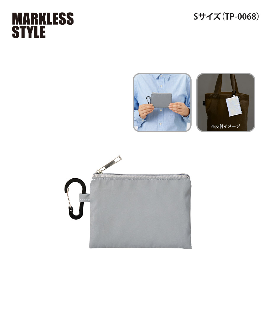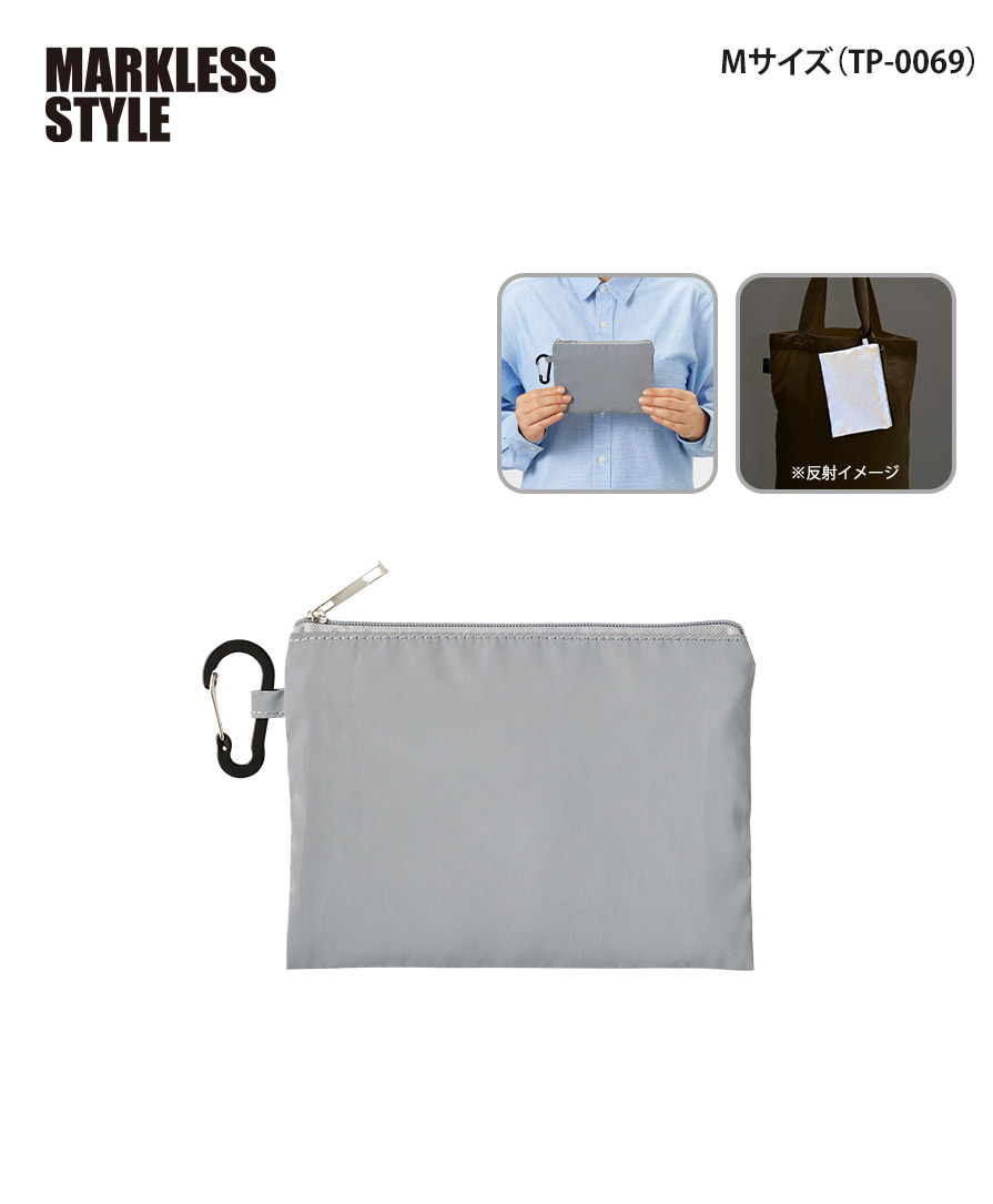 暗闇でキラッと存在感。視認性を高める反射素材を全面に使った、マークレススタイル(MARKLESS STYLE)のリフレクターポーチ。夜道や早朝の移動時、光を受けてしっかり反射するので、防犯対策や交通安全グッズとして心強いアイテムです。カラビナ付きポーチ仕様だから、バッグやベルトループにサッと装着でき、日常使いのミニポーチとしても優秀。