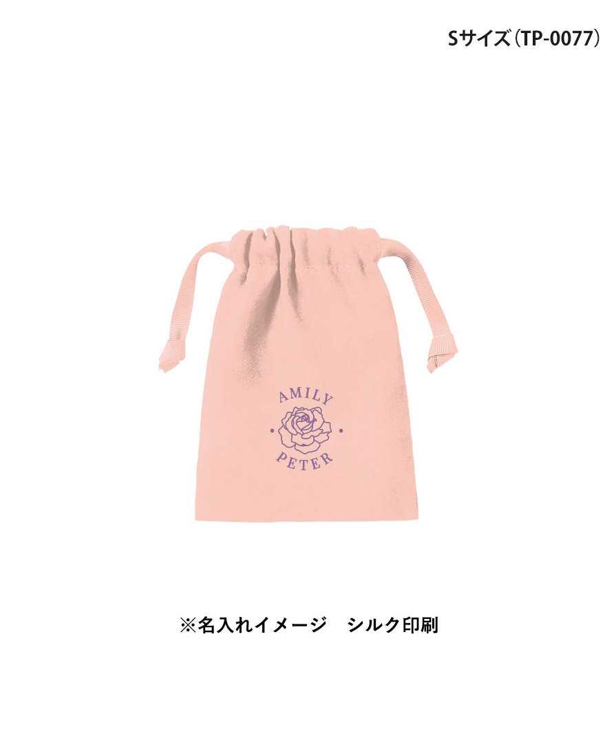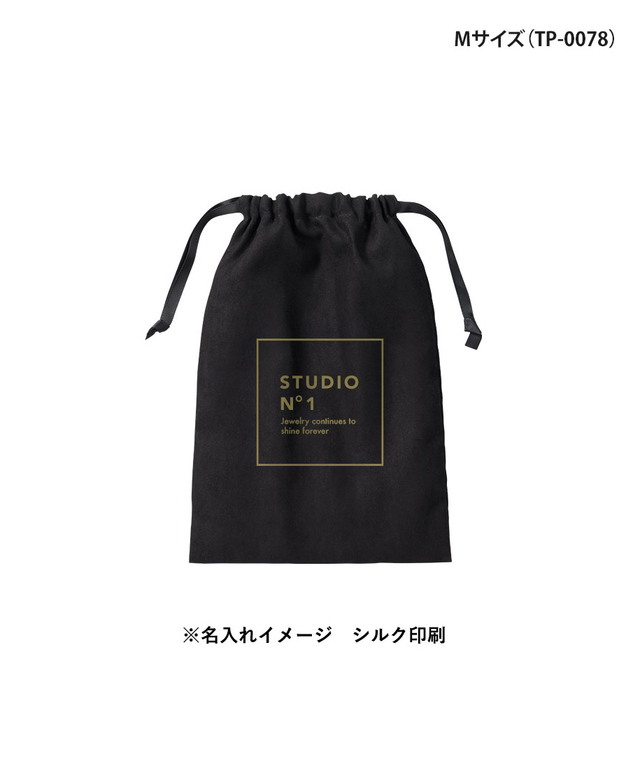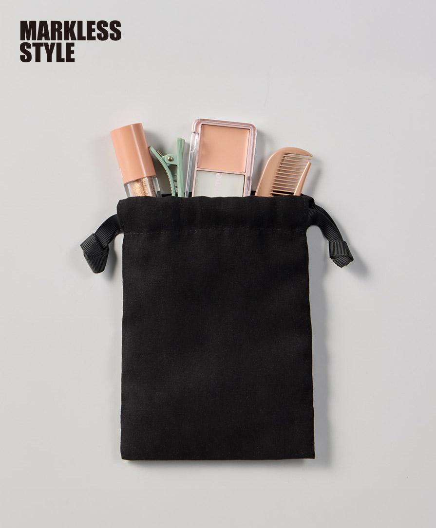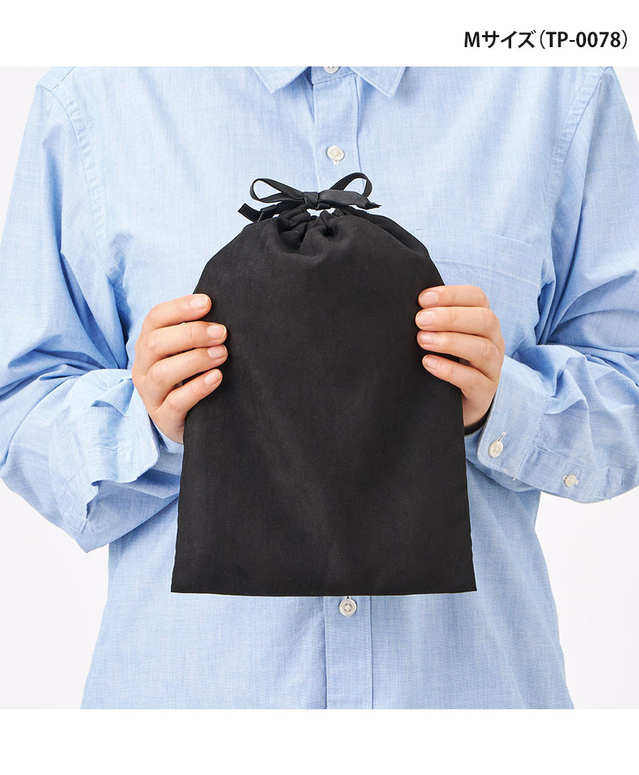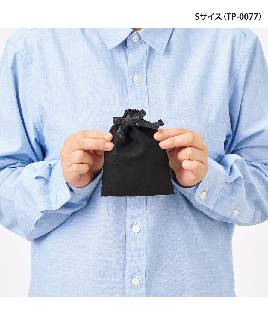 サイズはS・M・Lの3展開。Sサイズはジュエリーポーチやコスメ用巾着として使いやすく、Mサイズはハンドクリームや化粧品のギフト巾着に最適。Lサイズになると薄手のシャツも収まるため、アパレルノベルティや秋冬向けのギフトバッグとしても活躍します。ブランドロゴやキャラクターを名入れすれば、オリジナル巾着として訴求力も十分。ノベルティ巾着やパッケージ用巾着として、企業やブランドの世界観を損なわずに価値を高められます。高級巾着でありながら実用性も高く、日常使いから特別な贈り物まで幅広く対応できるスウェード調ポーチです。