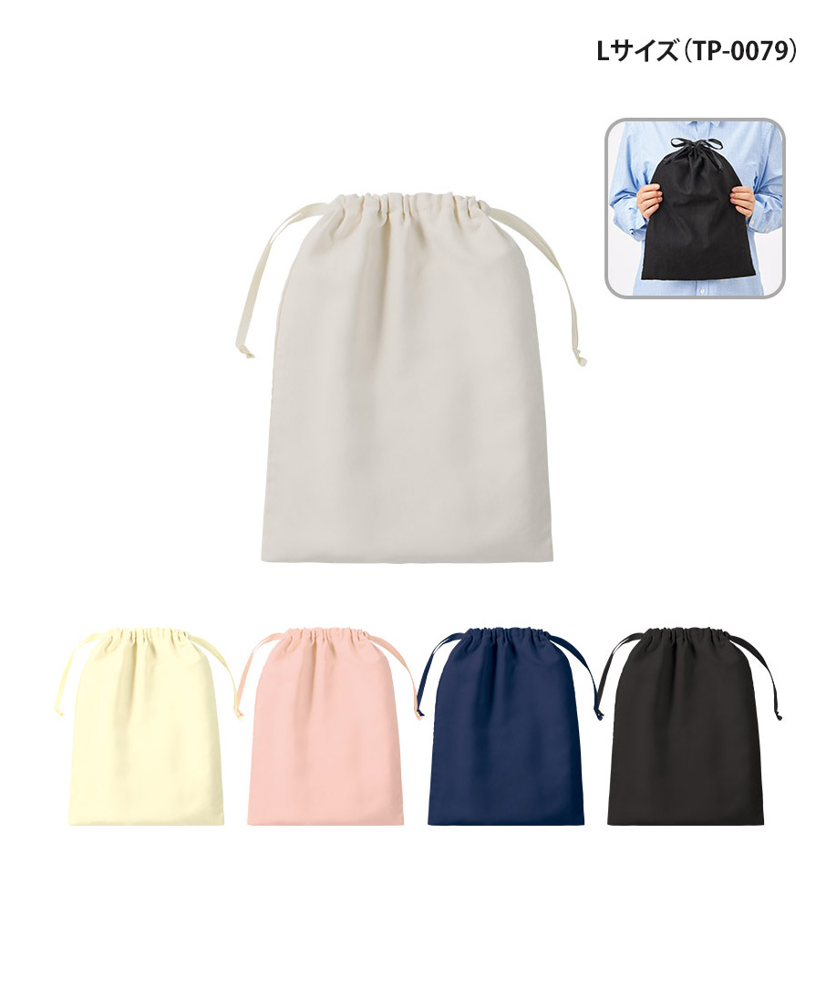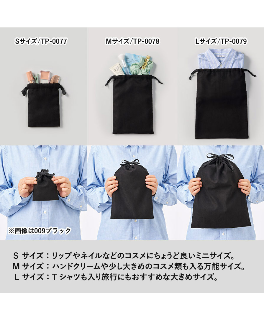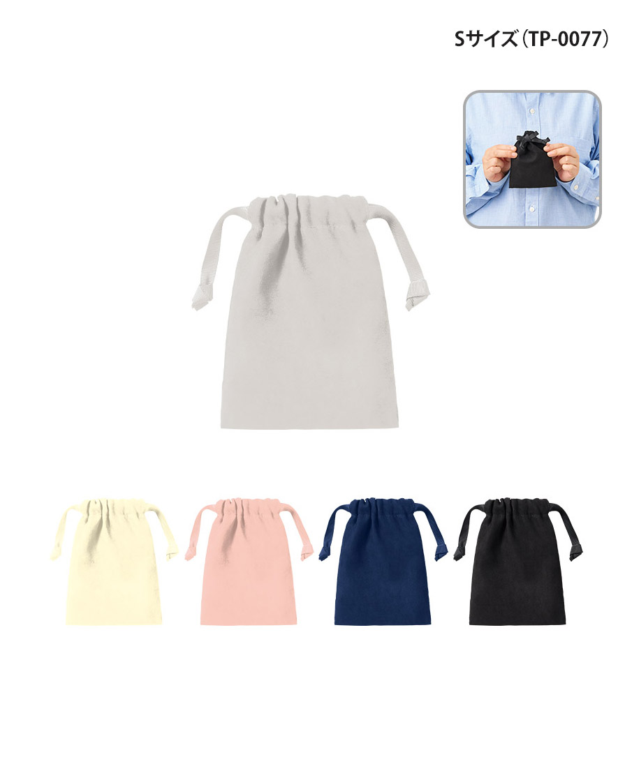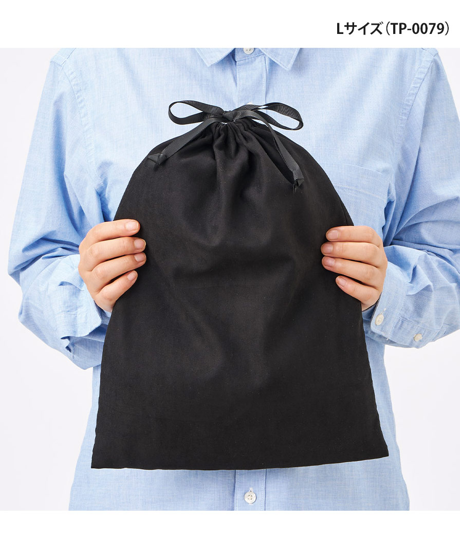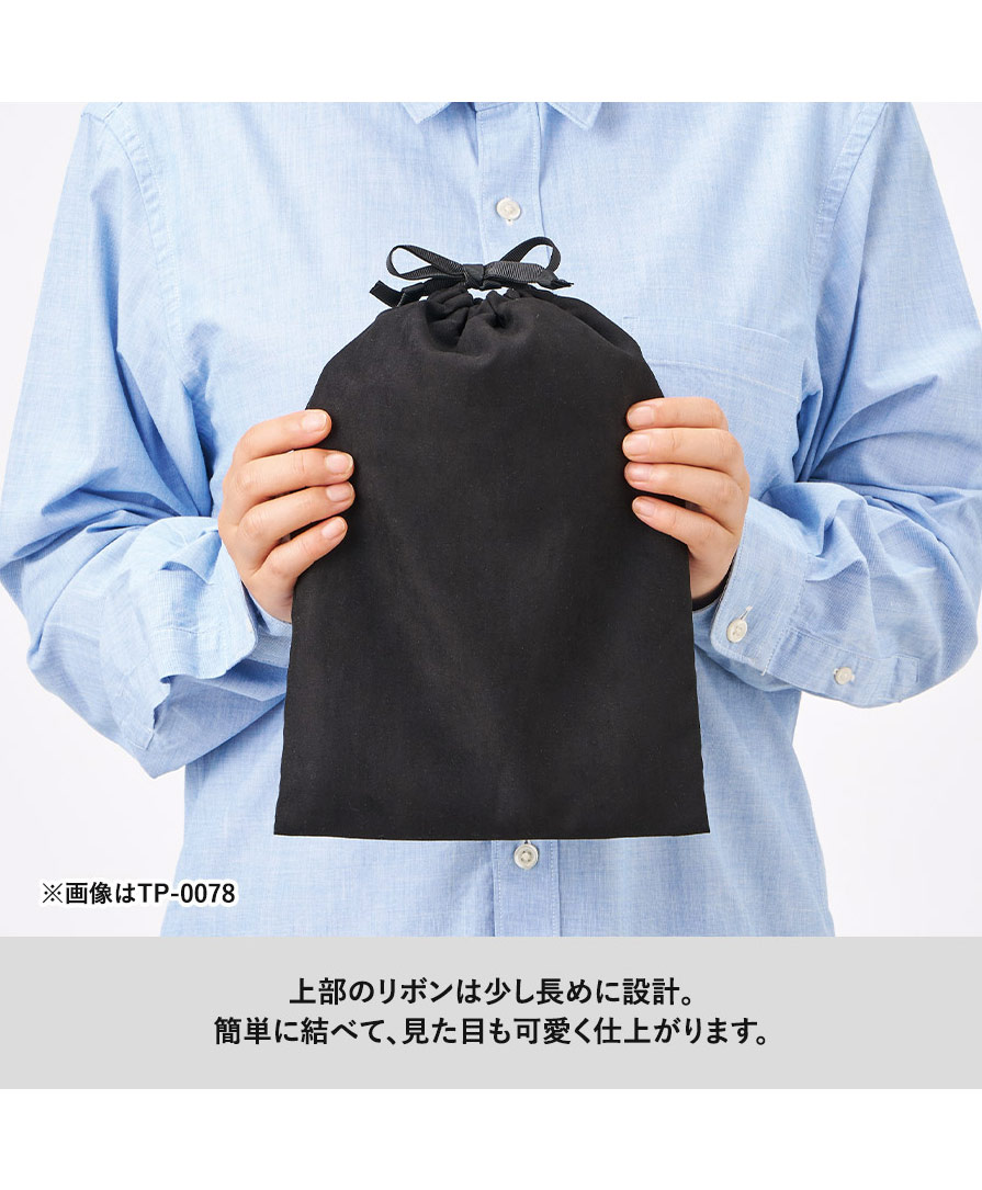 サイズはS・M・Lの3展開。Sサイズはジュエリーポーチやコスメ用巾着として使いやすく、Mサイズはハンドクリームや化粧品のギフト巾着に最適。Lサイズになると薄手のシャツも収まるため、アパレルノベルティや秋冬向けのギフトバッグとしても活躍します。ブランドロゴやキャラクターを名入れすれば、オリジナル巾着として訴求力も十分。ノベルティ巾着やパッケージ用巾着として、企業やブランドの世界観を損なわずに価値を高められます。高級巾着でありながら実用性も高く、日常使いから特別な贈り物まで幅広く対応できるスウェード調ポーチです。
