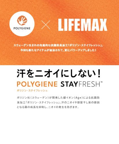 ポリジン加工とはスウェーデン発の銀イオンによる抗菌防臭加工。原因菌の成長を抑制し、においの発生を防ぐ。有効成分の塩化銀はリサイクルされた銀を使用。環境にやさしく無香料なので周りの人にも安心です。