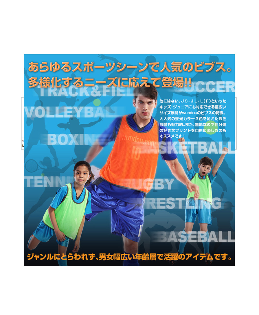 ありとあらゆるスポーツシーンで活躍するビブス。フロリダウィンドのビブスはJS・JLサイズの展開があり、フットサルなどのキッズチームにも対応可能。大人サイズはスポーツ以外のイベントでも活用出来ます。人気の蛍光色を含めた5色。背番号、チーム名、企業ロゴなどをプリントする二次加工の素材としても 引き合いの多いアイテムです。オレンジパームでは1枚からオリジナルウエアの作成まで一貫して承っております。