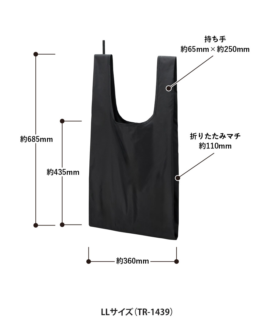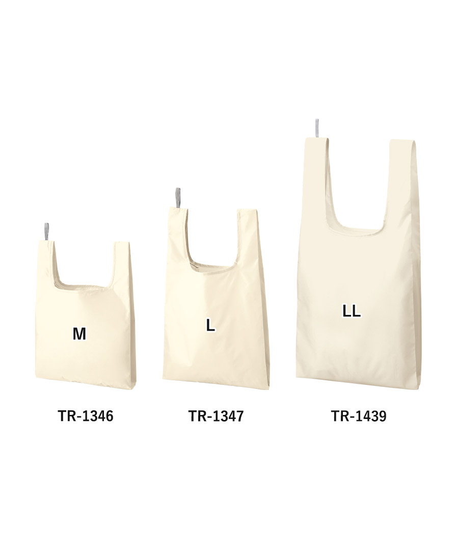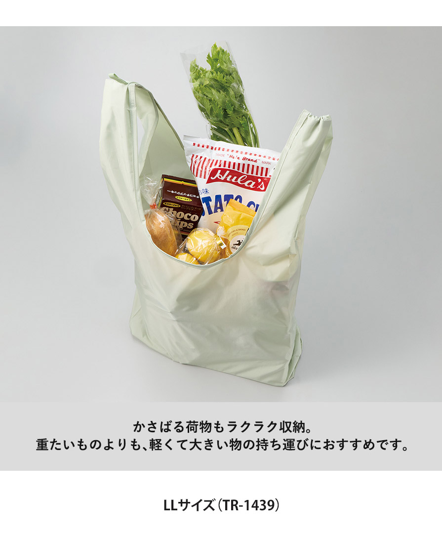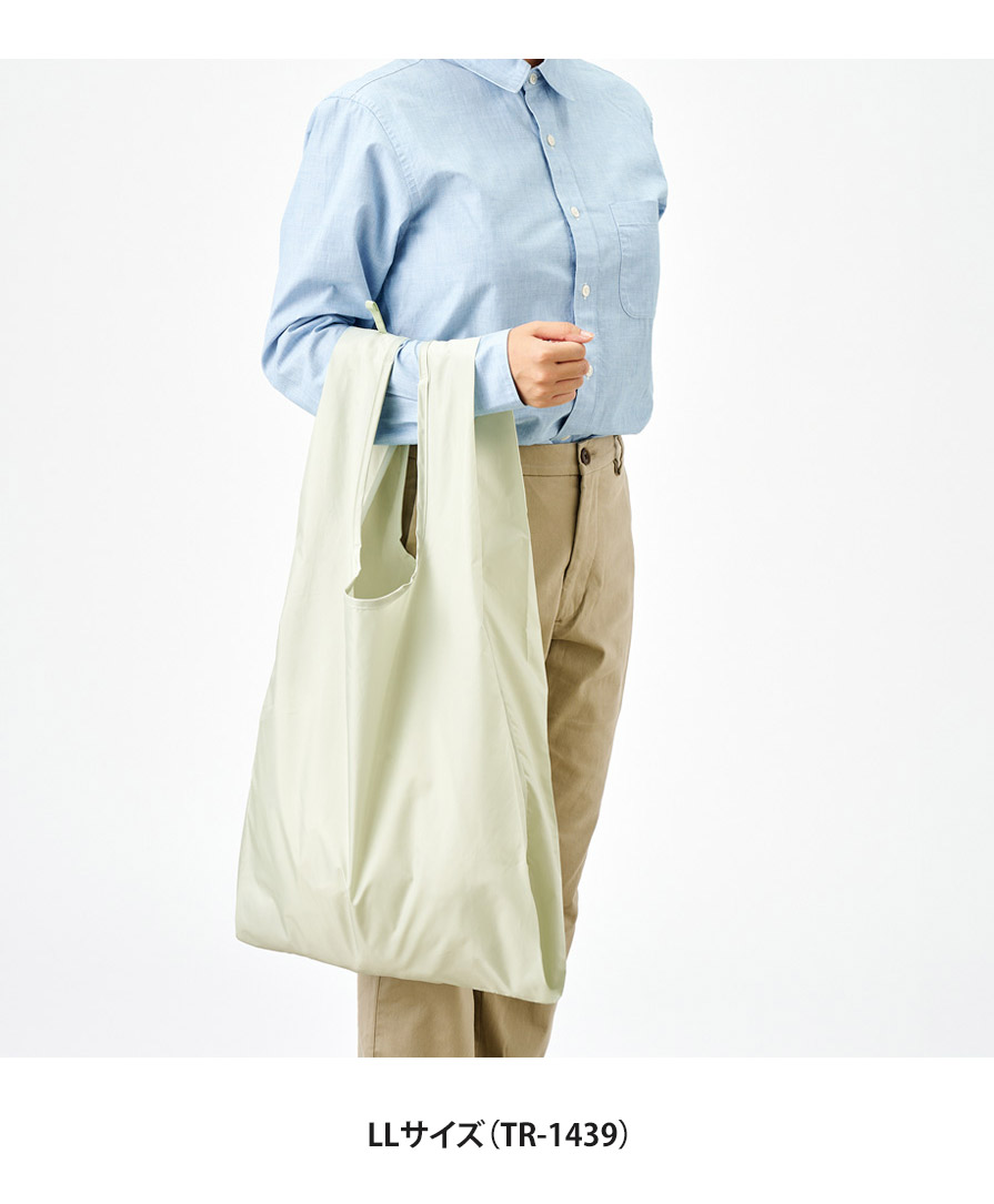 サイズはMサイズとLサイズの2サイズ展開。Mサイズは単三乾電池(約23g)程度の軽さで、持っていることを忘れるほどの軽量設計。お弁当などを入れるのに便利なサイズで、コンビニなどでのちょっとしたお買い物時に便利です。Lサイズは2Lボトルも余裕で入る大容量。荷物が多くなりそうなお買い物の日にぴったりです。