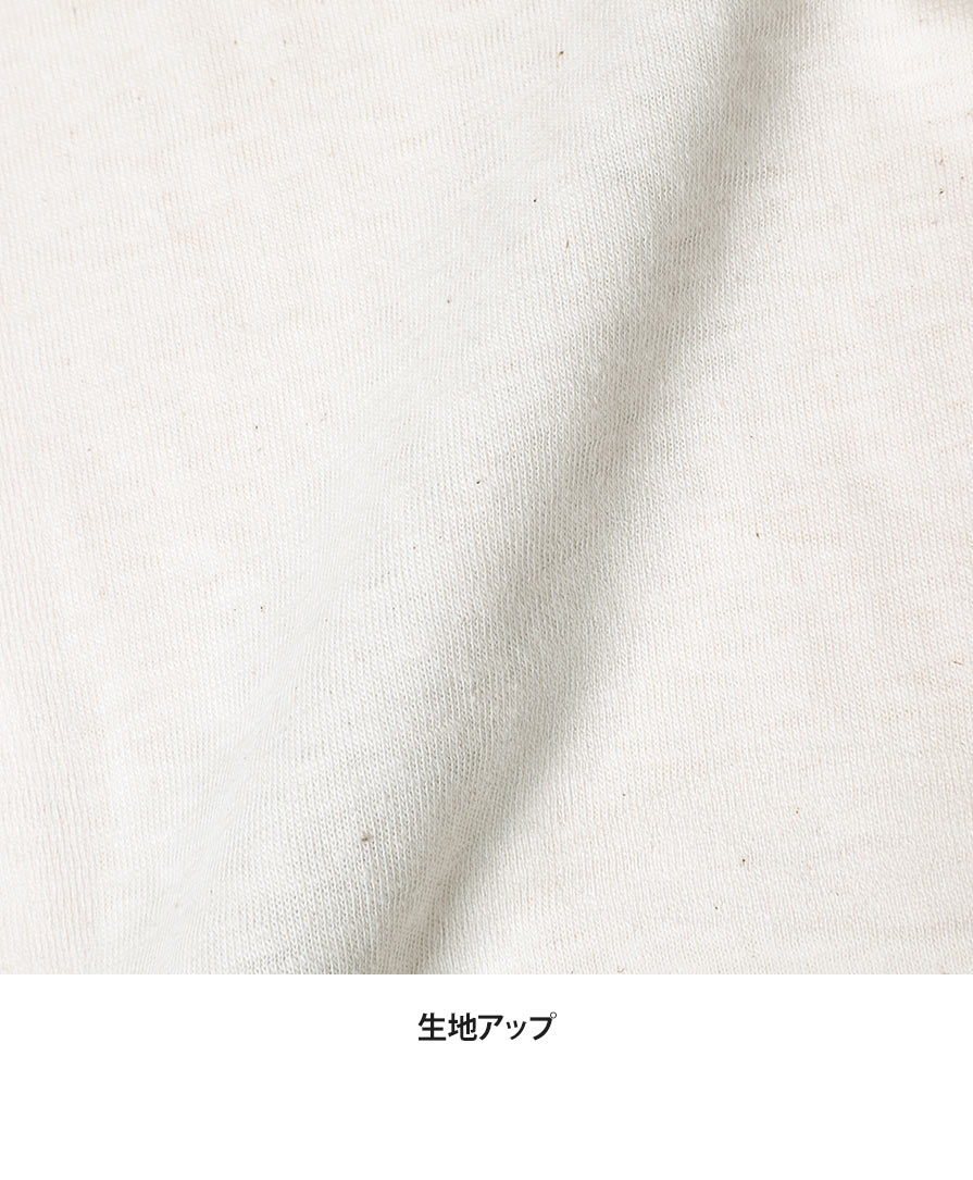 170g/㎡(5.0oz)の中肉厚な生地は、手に取った瞬間に伝わるふくらみと、凹凸感のある豊かな風合いが魅力。1枚で着ても透けにくく、洗うほどに肌に馴染み、ヴィンテージウェアのような奥行きのある経年変化を楽しめるのが特徴です。