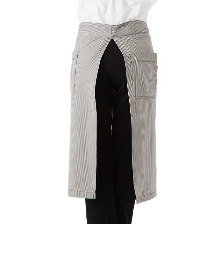エプロンの左前には使いやすい大きめのポケット、右後ろにはペン差し付きのポケット付き。メンズ・レディース兼用で使用でき、エプロン前部のスリットで足の動きを邪魔することなく、男性の方でも足さばきが楽に快適に動けます。