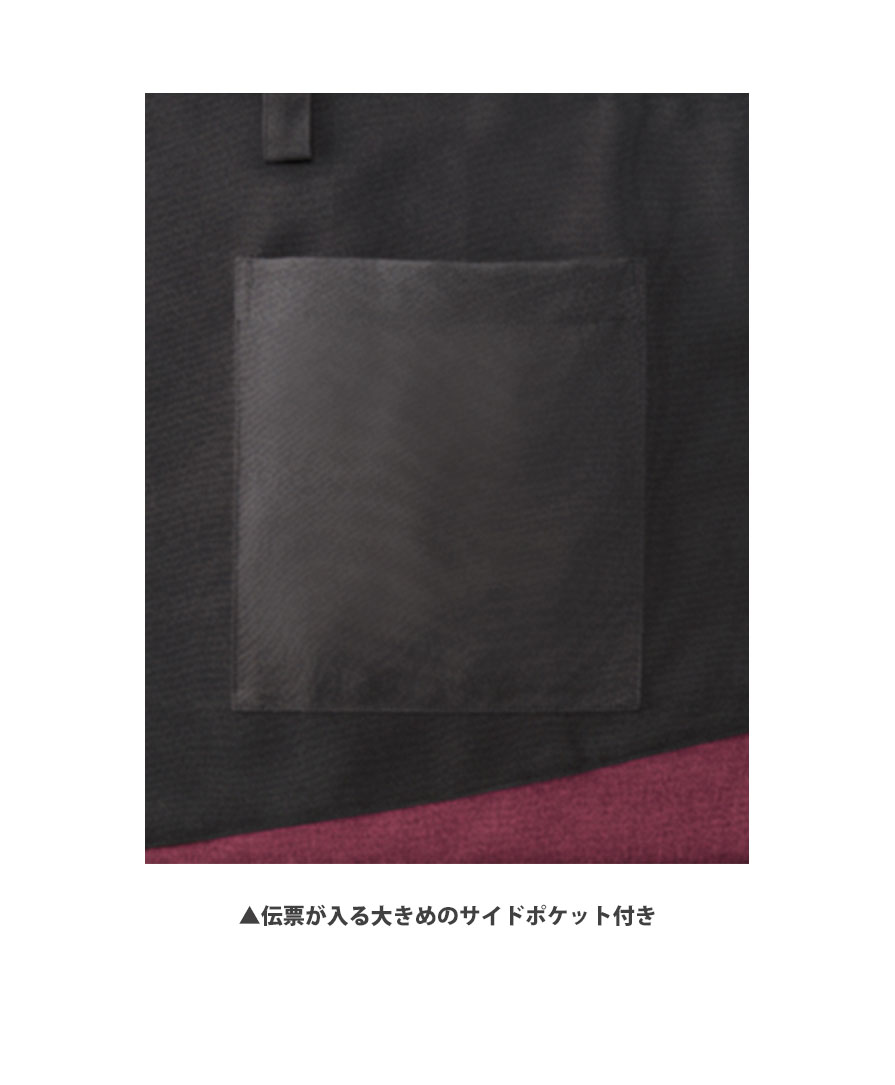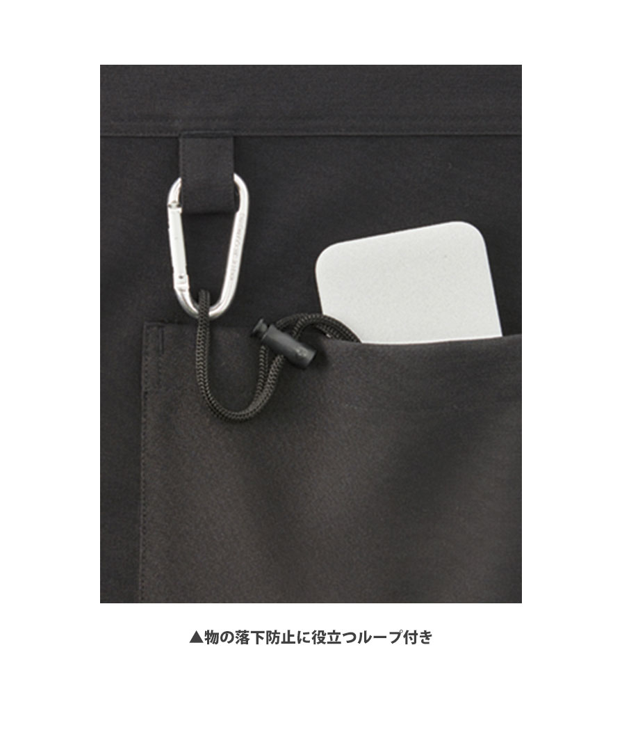 右腰には伝票が入る大きめのサイドポケット付きで便利。さらに右側ウエストには便利なタブ(ループ)が付いてますので、カラビナを装着することで、ポスやスマホなどの落下を防止でき機能面でも優れています。