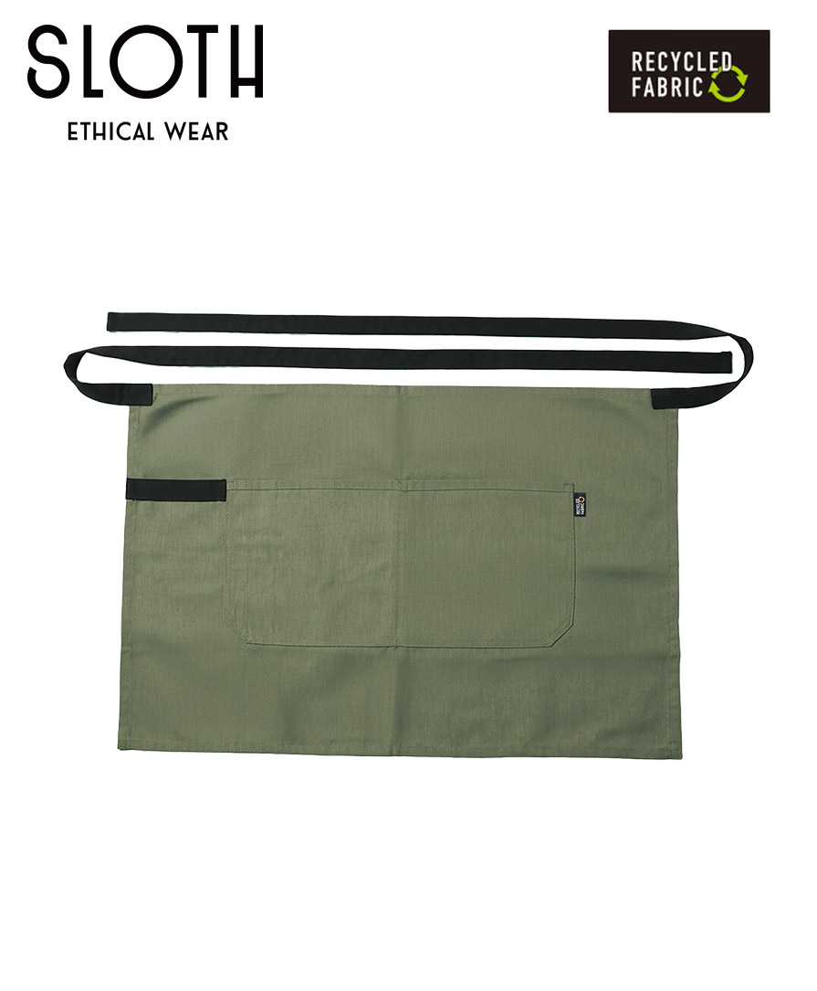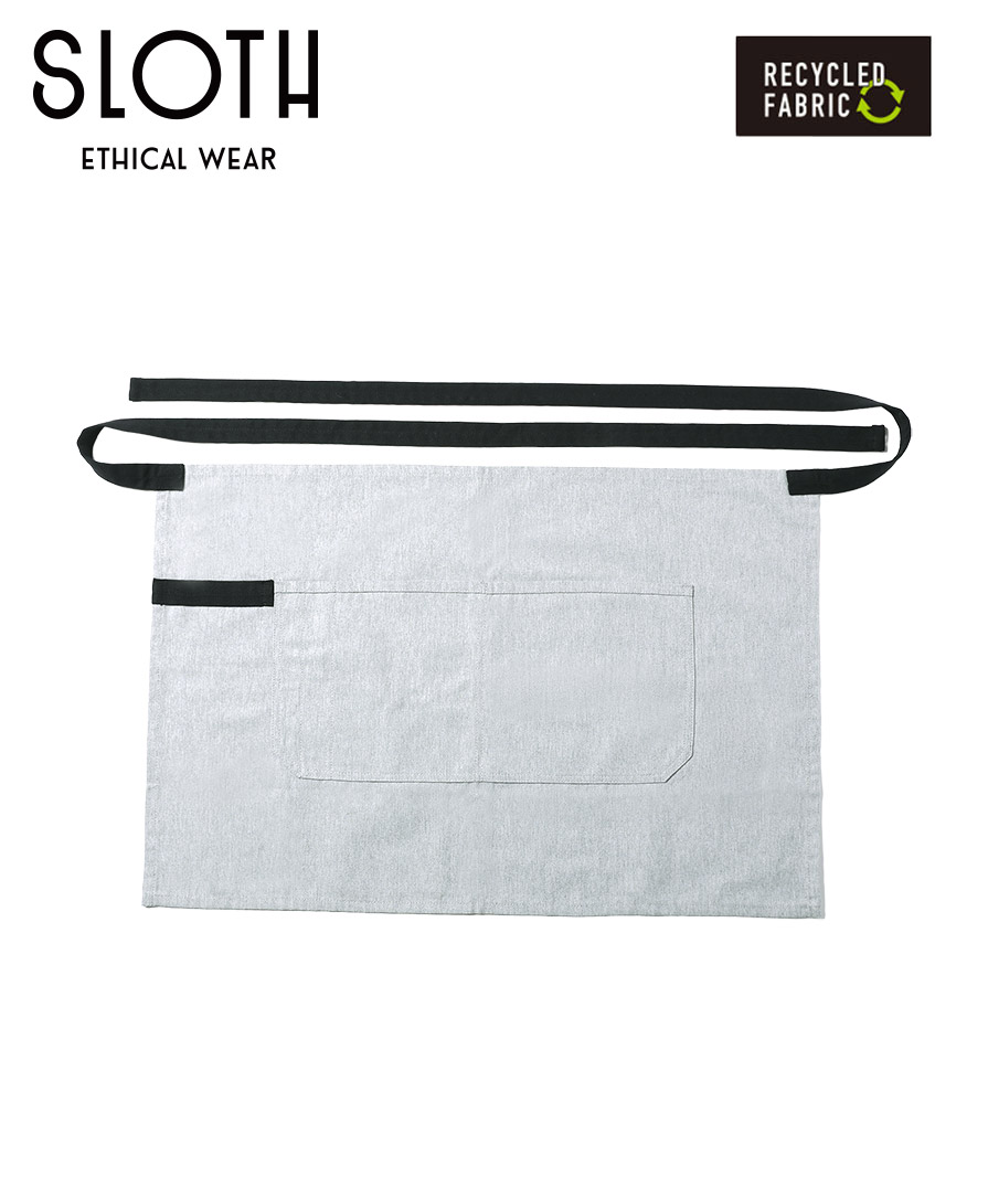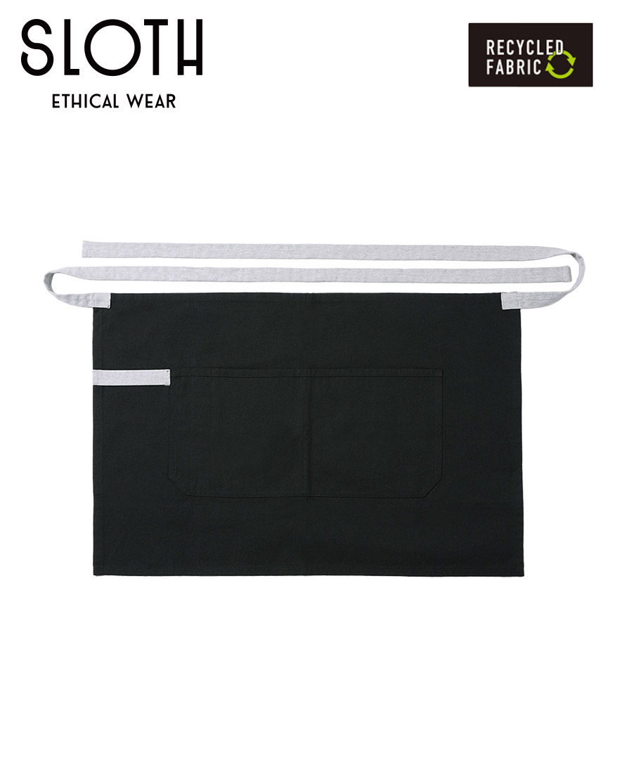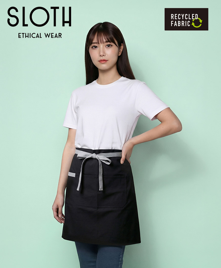 バイカラーの配色デザインが、フォーマルすぎずラフすぎない、SLOTH スタイリッシュカフェエプロン(ST2404)。腰下タイプのショートエプロンは前中心丈45cmの軽快設計、足さばきもよく、忙しい現場でもストレスフリー。素材にはリサイクルコットンと再生ポリエステルをブレンドした8.5ozの厚手キャンバスを採用。ガシガシ洗えてへたりにくいタフさと、再生コットンならではのナチュラルな風合いも魅力です。