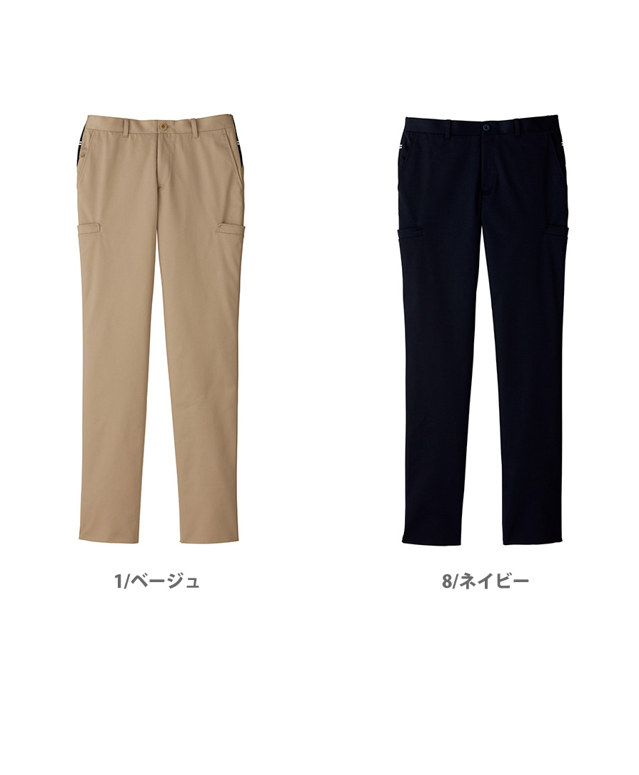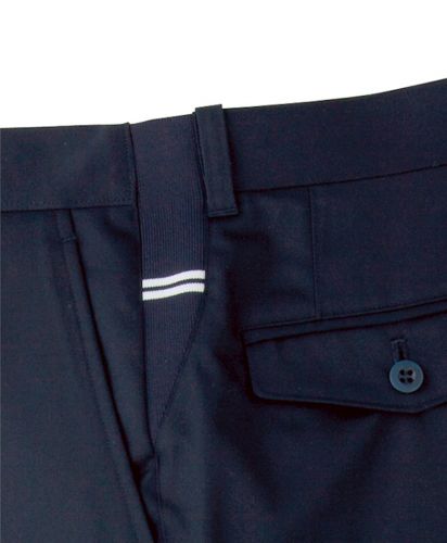 ポリエステル75% 綿25%ストレッチツイル両腰斜めポケット 右側チケットポケット両脇箱ポケット 後ろ両側両玉縁ポケット左側フラップ付き釦止め後ろ脇側ウエストリブ仕様