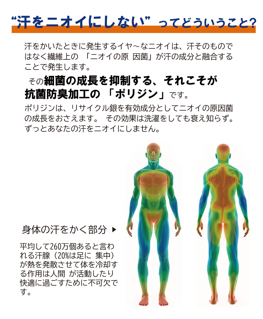 ポリジン加工とはスウェーデン発の銀イオンによる抗菌防臭加工。原因菌の成長を抑制し、においの発生を防ぐ。有効成分の塩化銀はリサイクルされた銀を使用。環境にやさしく無香料なので周りの人にも安心です。