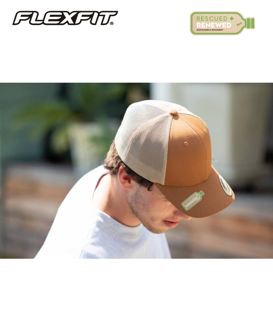 リサイクルペットボトルから生成されたFLEXFITのRecycledシリーズ!日本限定モデルの再生繊維を利用したサステナブルなメッシュキャップ。GRS(Global Recycled Standard)認証商品で、廃棄されるプラスチックの削減に貢献する次世代のヘッドウエアアイテムです。