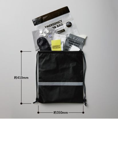【各商品サイズ】マスク/約165×95(mm)圧縮タオル/広げた時:約200×220(mm)アルミブランケット/約700×1400(mm)携帯トイレ/132×275(mm)携帯トイレ付属ごみ袋/240×455(mm)ウォーターバッグ/約300×270(mm)アイマスク/185×85(mm)ネックピロー/440×265(mm)乾電池式モバイルチャージャーワイド/65×80×20(mm)防災ガイド/70×105(mm)