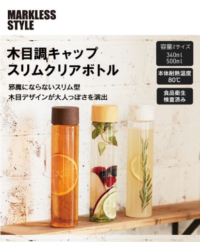 木目調のキャップがおしゃれなクリアボトル。340mlと500mlの2...