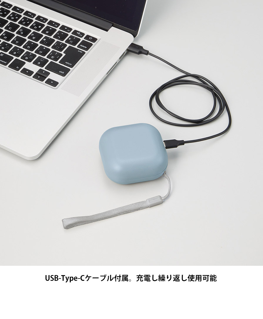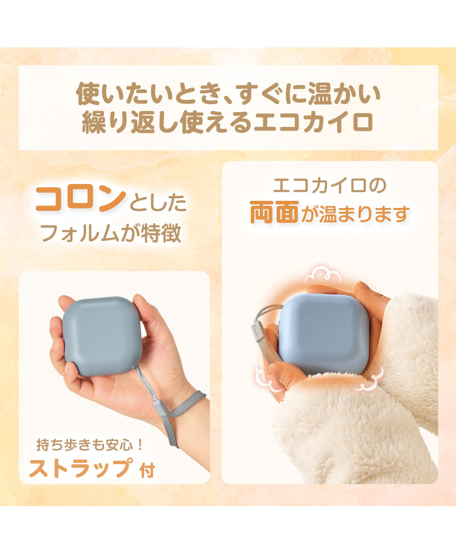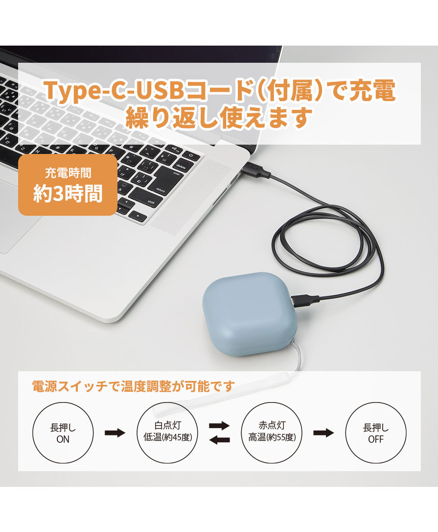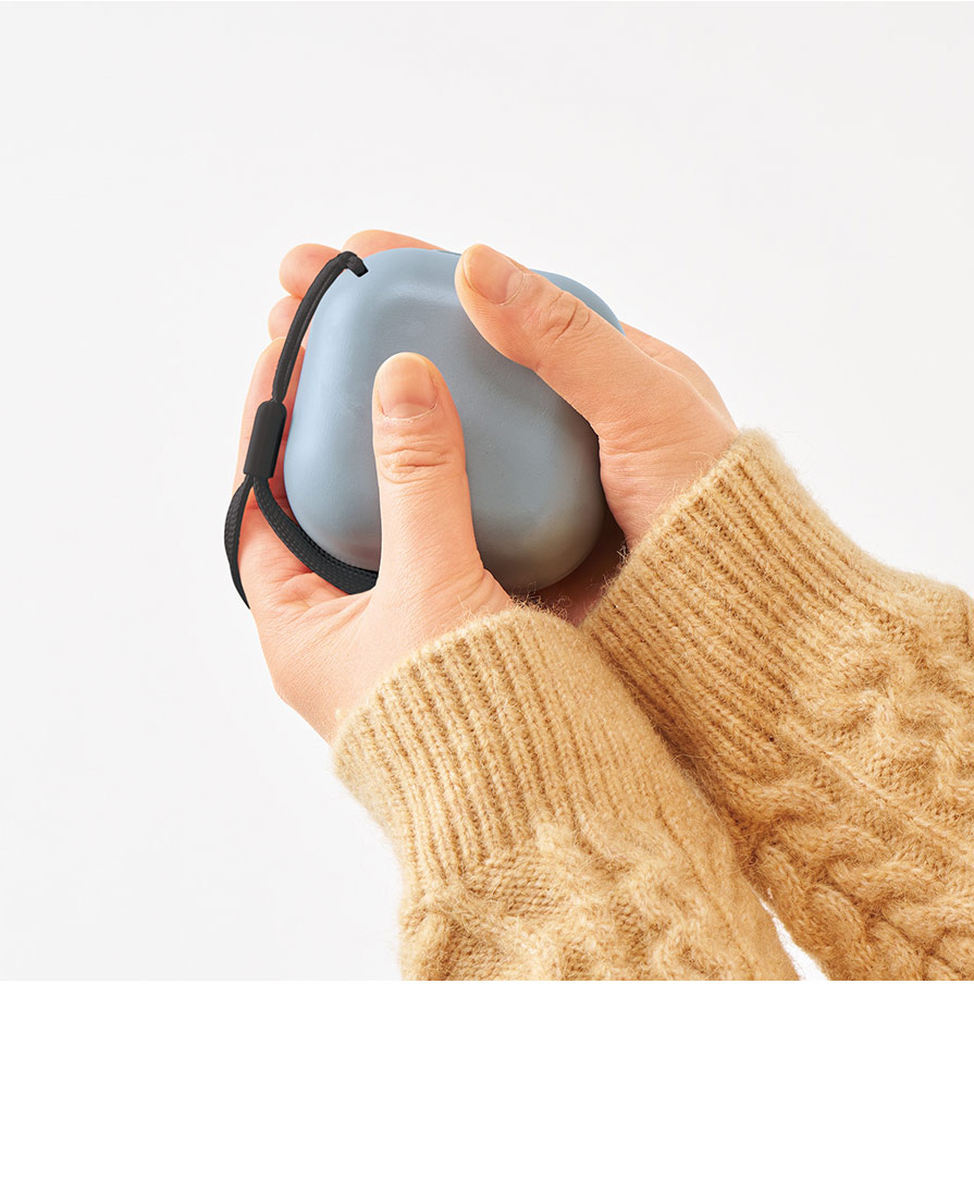 丸みのあるコロンとしたフォルムとマットな質感がかわいらしく、ブラック・ホワイト・くすみブルーの3色展開。性別や年代を問わず持ちやすいデザインで、冬ギフトや来店ノベルティにも好評です。ストラップ付きだから持ち歩きも快適。デスクワークや通勤通学、屋外イベントやアウトドア、フェスなど、寒い時期のあらゆるシーンで重宝します。