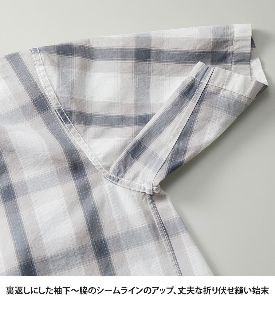 製品洗いを施したコットンシャツは、ほどよく力の抜けた風合いで、ヴィンテージ風シャツのような表情も魅力。軽やかでやさしい肌触りのリラックスシャツとして、街でも旅先でも活躍します。左胸ポケットやシェル調ボタンがさりげないアクセントになり、袖口から裾まで丁寧な折り伏せ縫い、アームホールのダブルチェーンステッチなど、ワークシャツ譲りのタフさもきちんと備えた、長く愛用できるアイテムです。