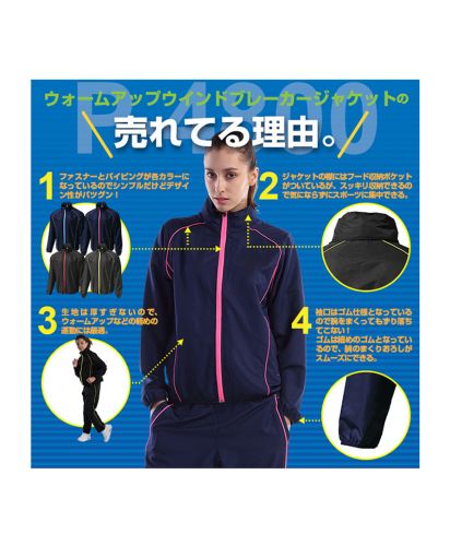 ファスナーとパイピングが同色の、 シンプルだけどデザイン性は抜群のウォームアップジャケット!着用時のシルエットは今までにないスタイリッシュさを演出しています。厚過ぎないポリエステル生地使用でシャカシャカしないところもポイント。襟にはフード収納ポケット付き。スッキリ収納できる仕様になっているので、気にならずにスポーツに集中できます。また袖口の細いゴムは腕をまくってもずり落ちてこない!随所随所にこだわりを施した、スポーツシーンに欠かせないアイテムです。 ※ご注意・水、汗で濡れたまま長時間放置しないで下さい。・タンブラー乾燥はお避け下さい。・色物の場合、白物と一緒に洗わないで下さい。
