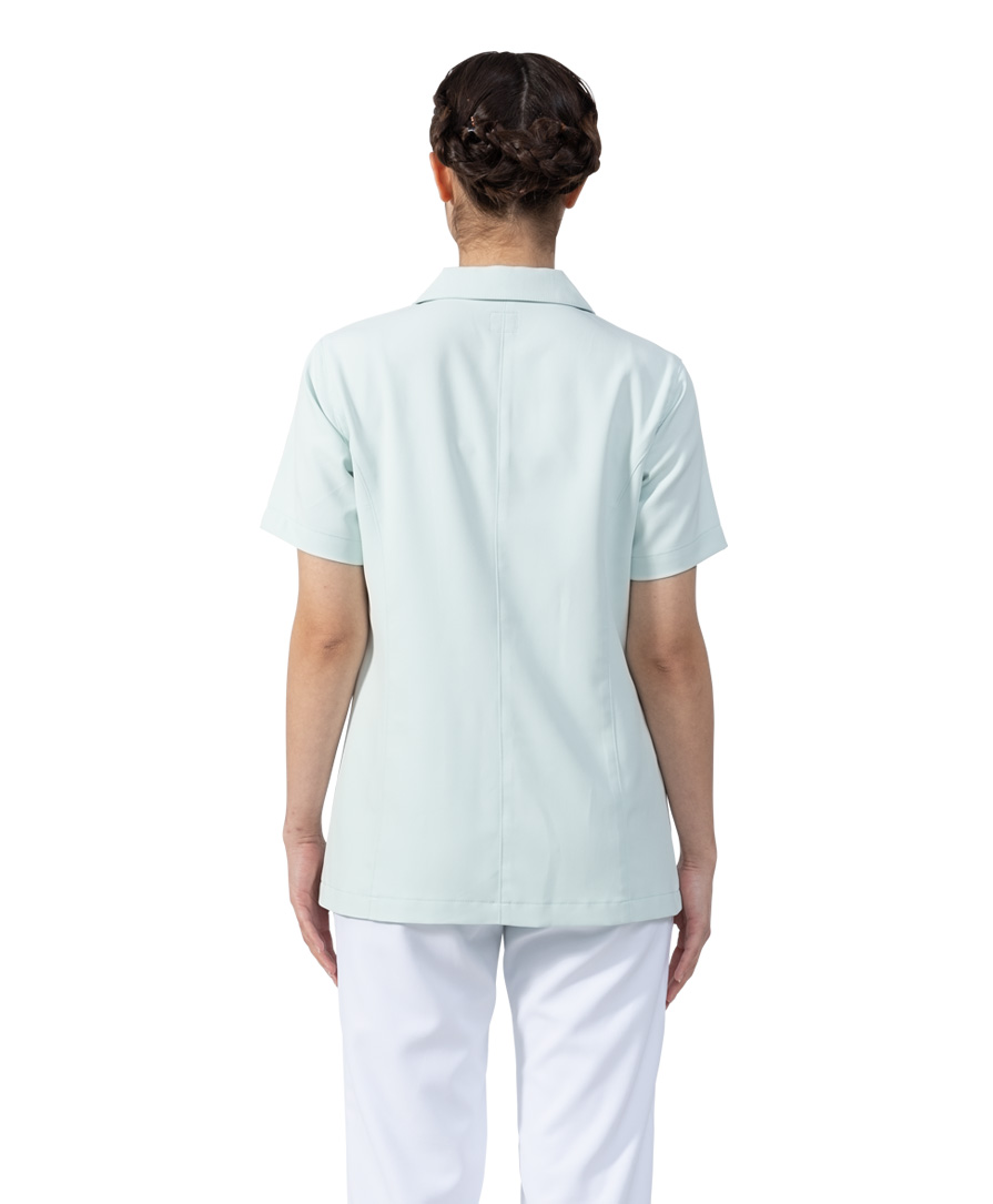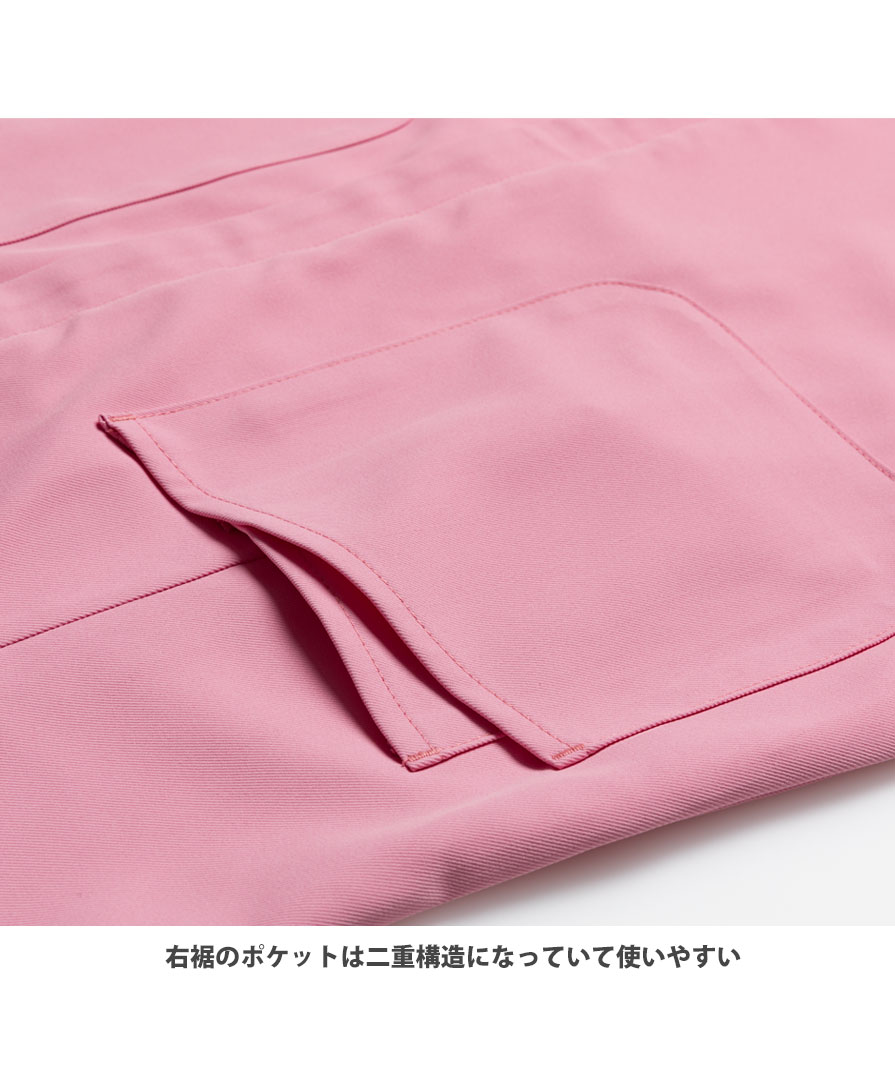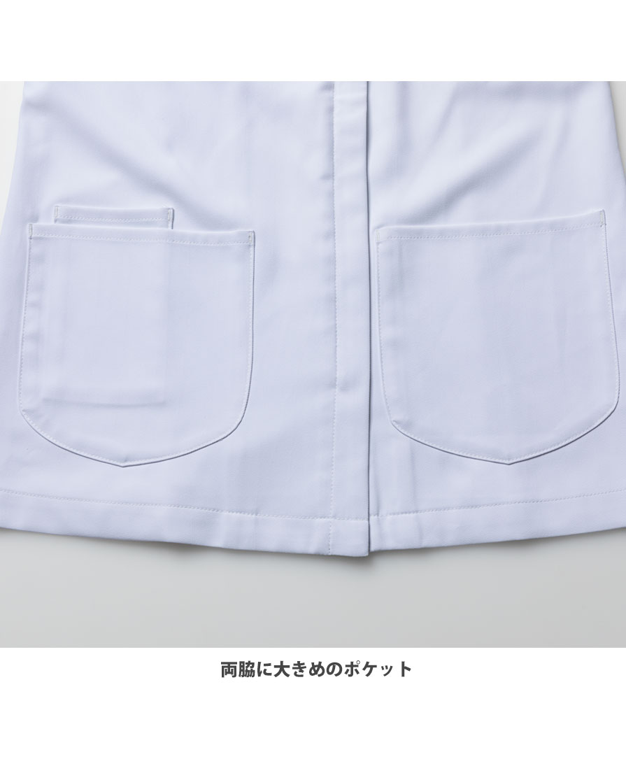 透けにくいツイル素材は肌なじみがよく、防透ジャケットに求められる安心感も十分。抗菌防臭のポリジン加工が汗のニオイを抑えてくれるので、長時間の診療や接客でも清潔で気持ちよく過ごせます。スクラブジャケットとしても白衣ジャケットとしても使いやすく、ホワイト・グリーン・ピンク・ラベンダーの優しい色が美容クリニックやエステサロンにも好印象。右裾の二重ポケットなど細かなディテールも、働く女性をしっかり支えてくれます。