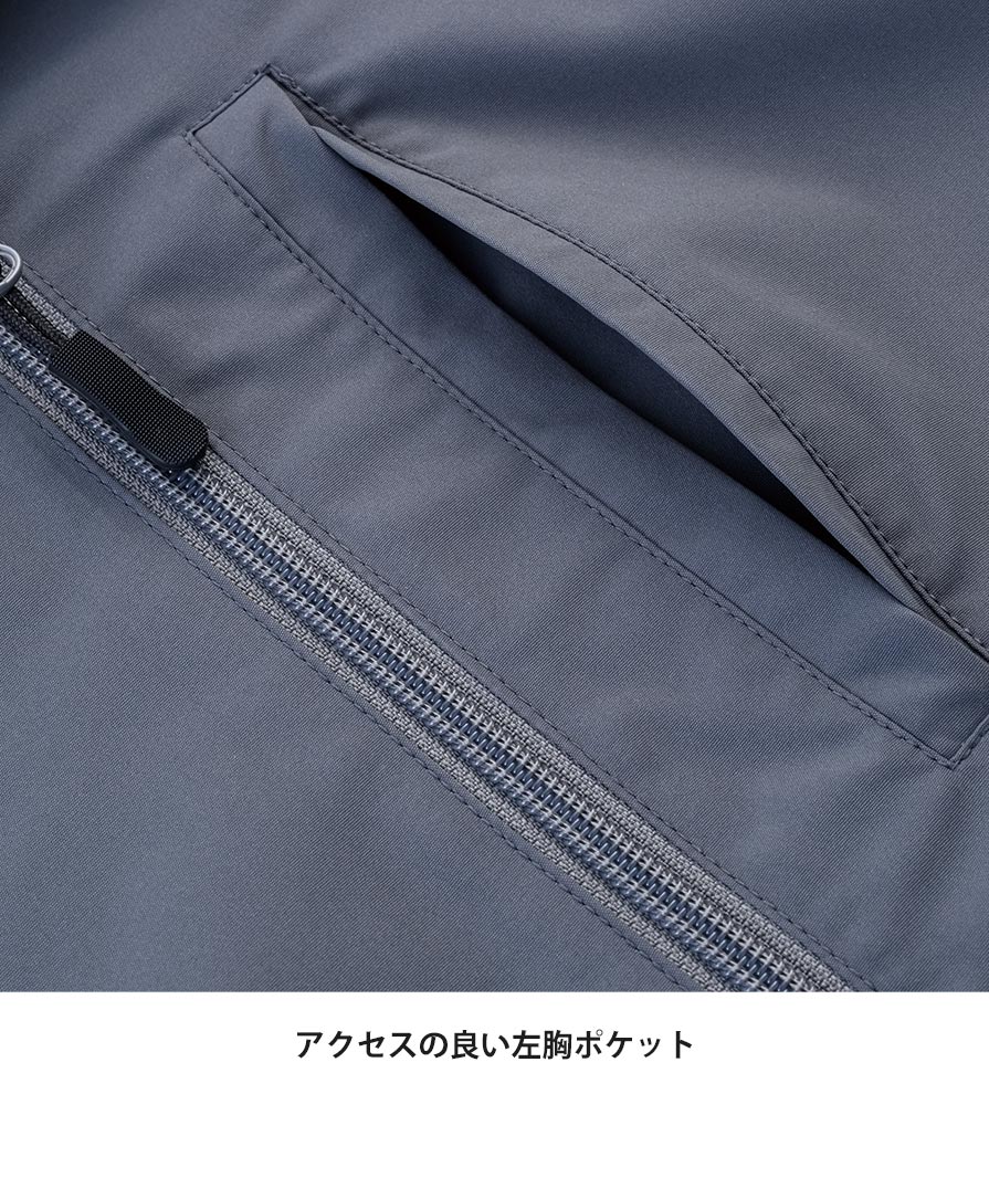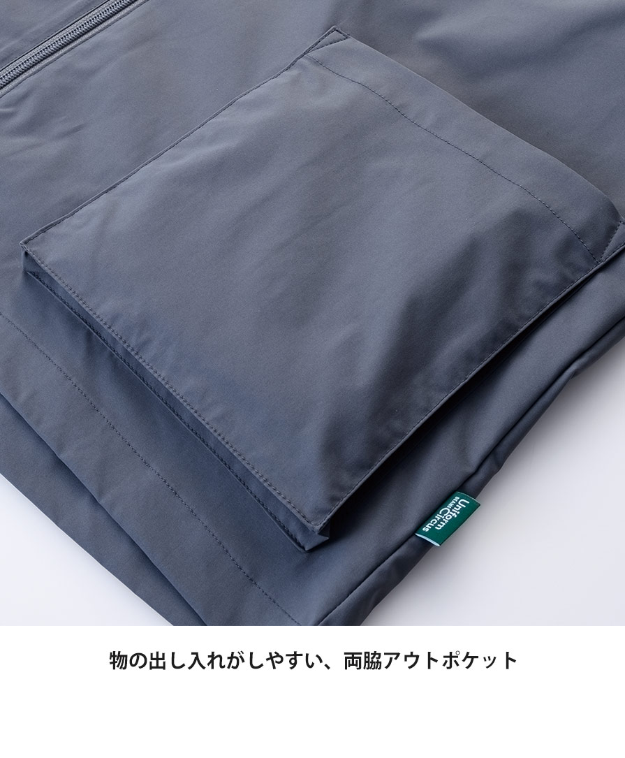素材には再生ポリエステルを使用したECO素材を採用。環境配慮型のワークジャケットとして、企業ユニフォームや制服ジャケットにも選びやすいのもポイントです。両脇にはマチ付きアウトポケットを備え、物の出し入れがスムーズ。アクセスしやすい左胸ポケットや、蒸れにくい背面フラシ仕様など、細部まで実用性を意識した設計が光ります。袖口はゴム仕様で、軽作業やイベント運営、サービス業の動きにも対応。
