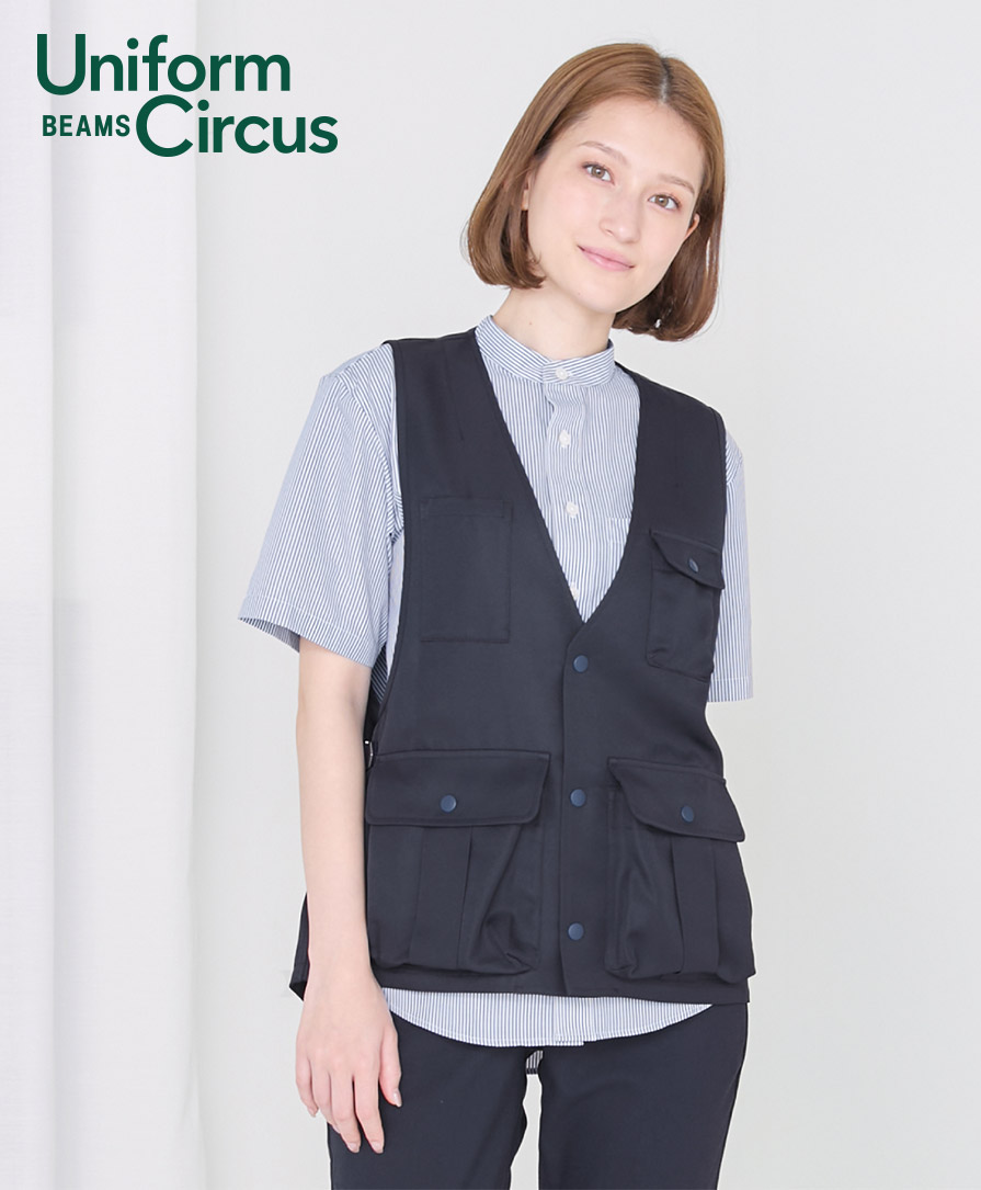 羽織る感覚で使え、収納力抜群!Uniform Circus BEAMS のエプロンベストは、デザイン性と作業効率を追求した多機能エプロン。腰巻きタイプとは違い、ベストエプロンならではの安定感があり、動いてもズレにくいのが魅力。フロントにはマチ付きポケットを複数配置し、ペンやメモ、タブレット、小型ツールまでしっかり収まる収納力エプロンに仕上がっています。