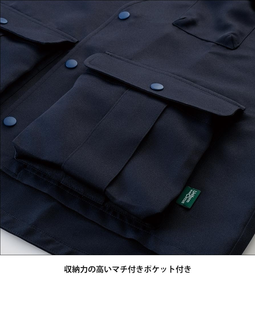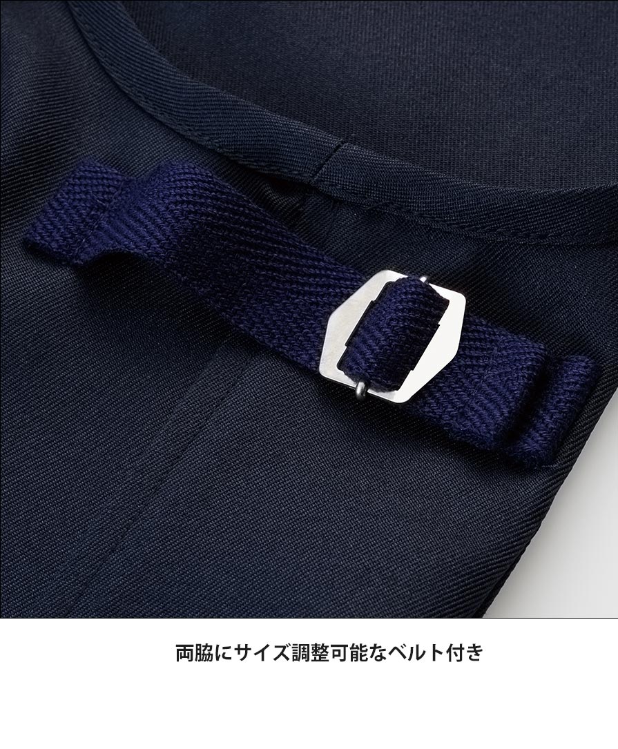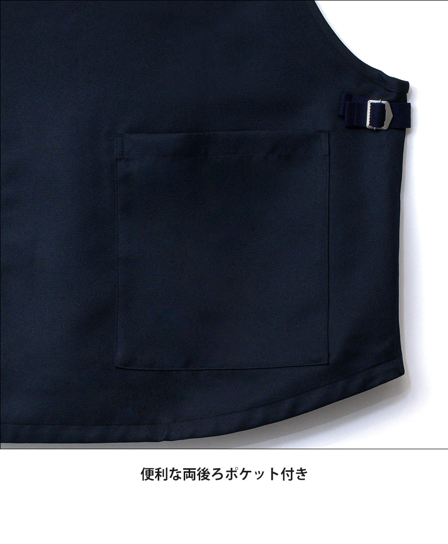 素材はポリエステル100%のツイル生地。程よいハリ感があり、業務用エプロンとしてタフに使えて、お手入れも簡単です。両脇にはサイズ調整ベルトを備え、体型やインナーに合わせてフィット感を微調整可能。背面には便利な両後ろポケットも付き、現場での動線を止めません。