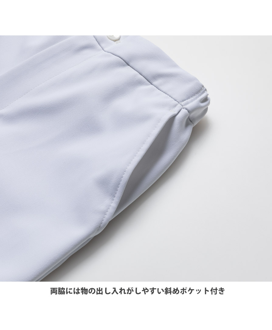 ウエストは前をすっきり見せつつ、後ろ側はゴム仕様で着脱しやすい前ファスナータイプ。屈伸や前かがみの動作が多い現場でも締めつけが少なく、長時間の勤務でも自然なフィット感をキープします。両脇のポケット、深めのバックポケットはスクラブパンツとして十分な収納力があり、後ろにはLeeワークウェアらしいネームがさりげなく主張。清潔感を保つ抗菌防臭「ポリジン」加工で、メディカルパンツとしての機能性も抜かりありません。