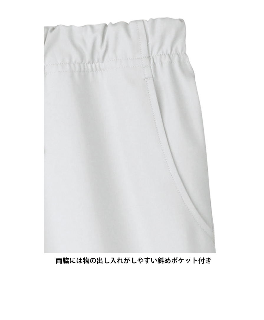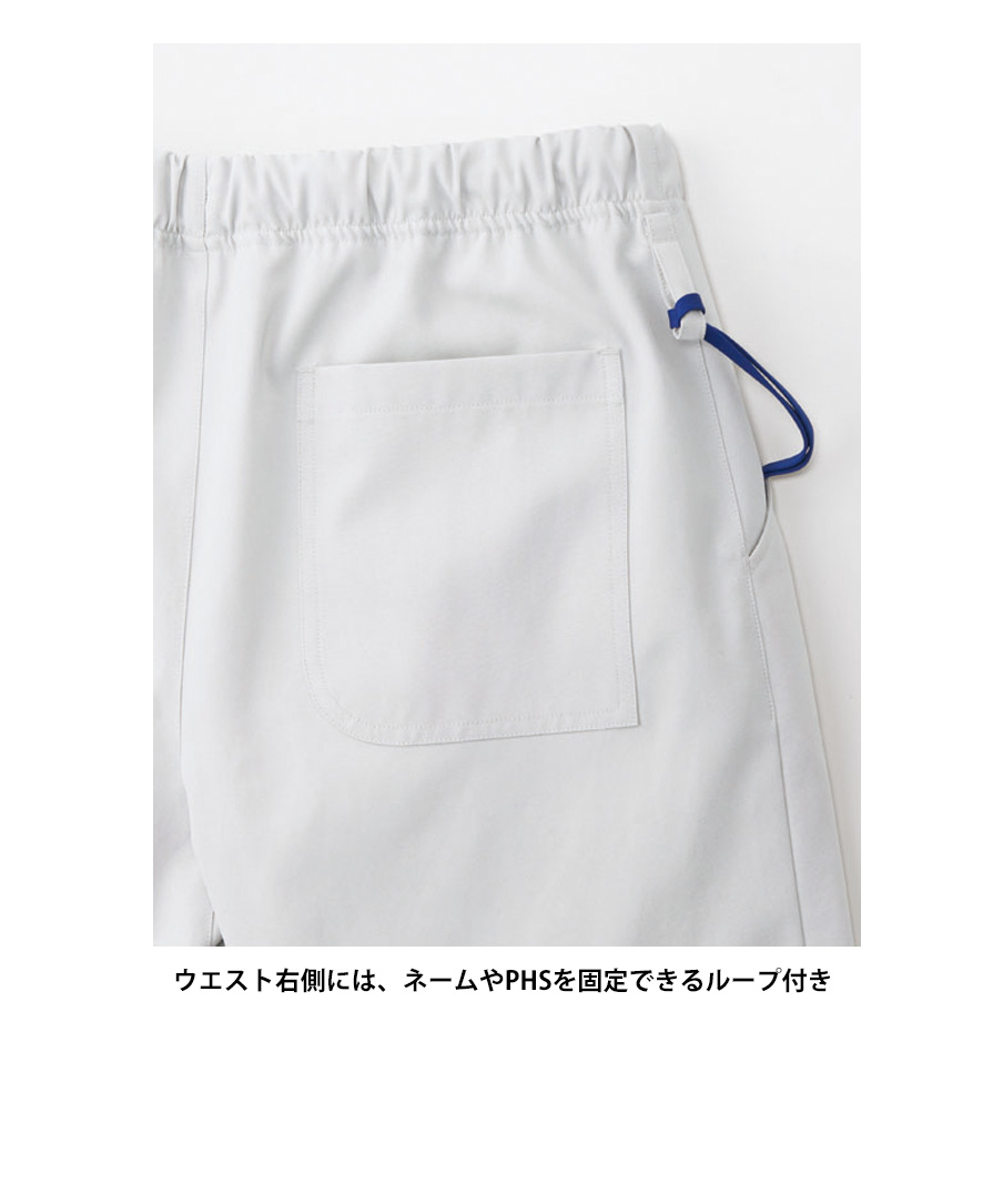 内股にはマチを入れて脚さばきが快適。屈伸やしゃがみ動作が多い医療ユニフォームパンツや介護ユニフォームパンツとして、自然な動きをサポートしてくれます。両脇の斜めポケットは出し入れしやすく、後ろ右のマチ付きアウトポケットは収納力もしっかり。さらにウエスト右側にはPHSやネームを固定できるループを搭載し、業務用スクラブパンツに必要な“細かな実用性”まで完備。動きやすいパンツを探す医療・介護現場に安心の設計です。