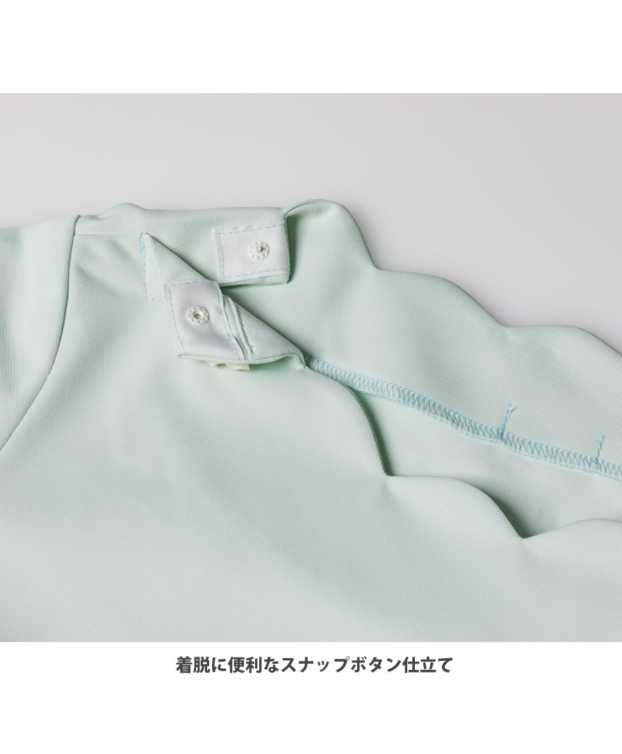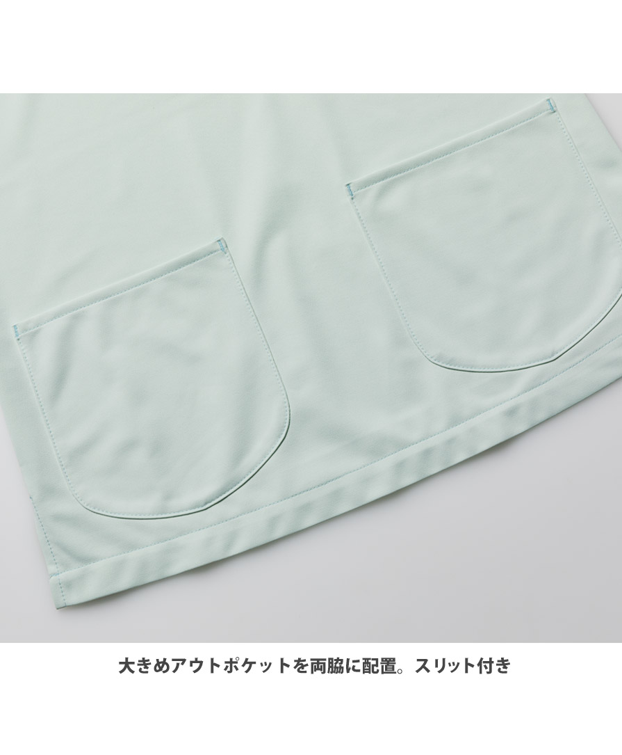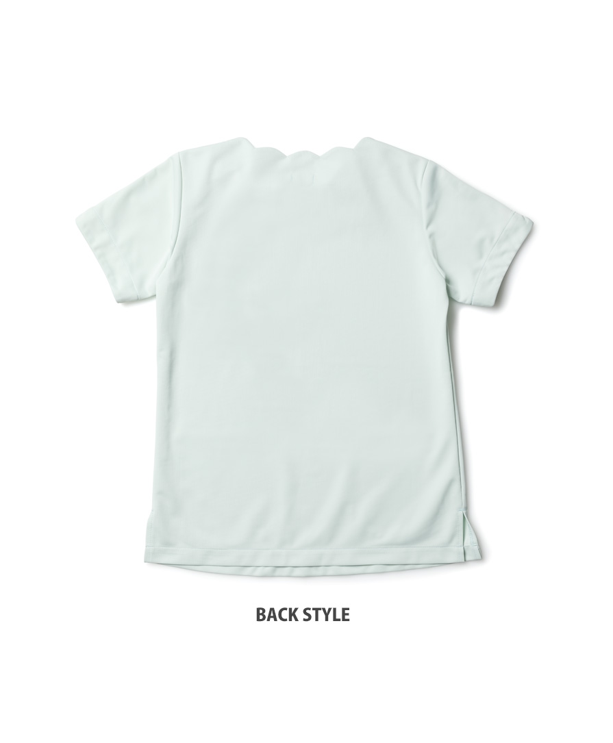 抗菌防臭スクラブとして人気のポリジン加工が施されているので、汗や湿気のニオイを抑え清潔感をキープ。襟元の内側には着脱に便利なスナップボタン、胸元にはペン差し付きポケット、両サイドには大きめポケット、裾にはスリットを入れ、医療ユニフォームとしての実用性も抜かりなく搭載されています。かわいい系のスクラブが欲しいけれど、きちんと機能するメディカルウェアじゃないと困る…そんな声に応えてくれる存在です。