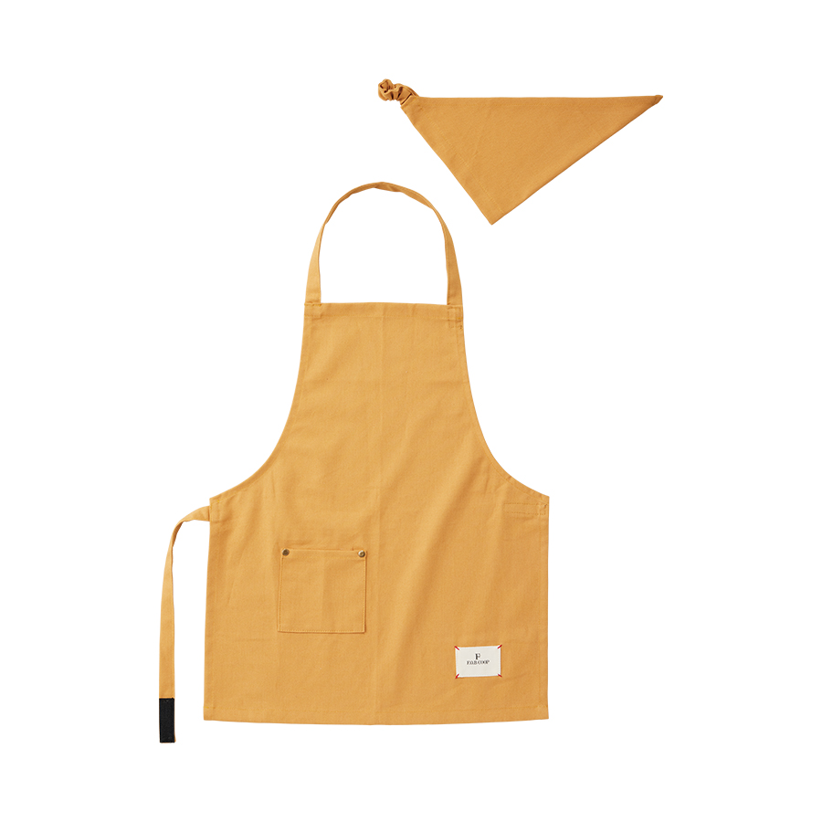 お子様でも安心の オーガニックコットン素材! 三角巾付きのかわいいキッズ用エプロン。対象年齢は5歳~9歳くらいとなっております。