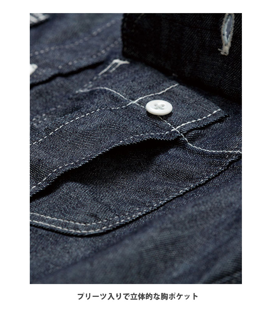 LeeのDNAが息づく本格派。ワークシャツの伝統と現代の機能性を融合させた メンズワーク長袖シャツ〈LWS46001〉。プリーツ入りの立体胸ポケットやLee独特のガゼットなど、ヴィンテージワークを思わせるディテールが魅力。ストレッチデニム(インディゴネイビー)とストレッチヒッコリー(ホワイト×ブルー)の2素材展開で、タフな作業服としてはもちろん、アメカジスタイルのカジュアルウェアとしても人気です。しなやかなストレッチ性を備えた生地が動きやすく、長時間の作業でも快適な着心地をキープ。肩や腕を動かしても突っ張りにくく、整備士シャツやカフェユニフォーム、サービスウェアとしても活躍します。