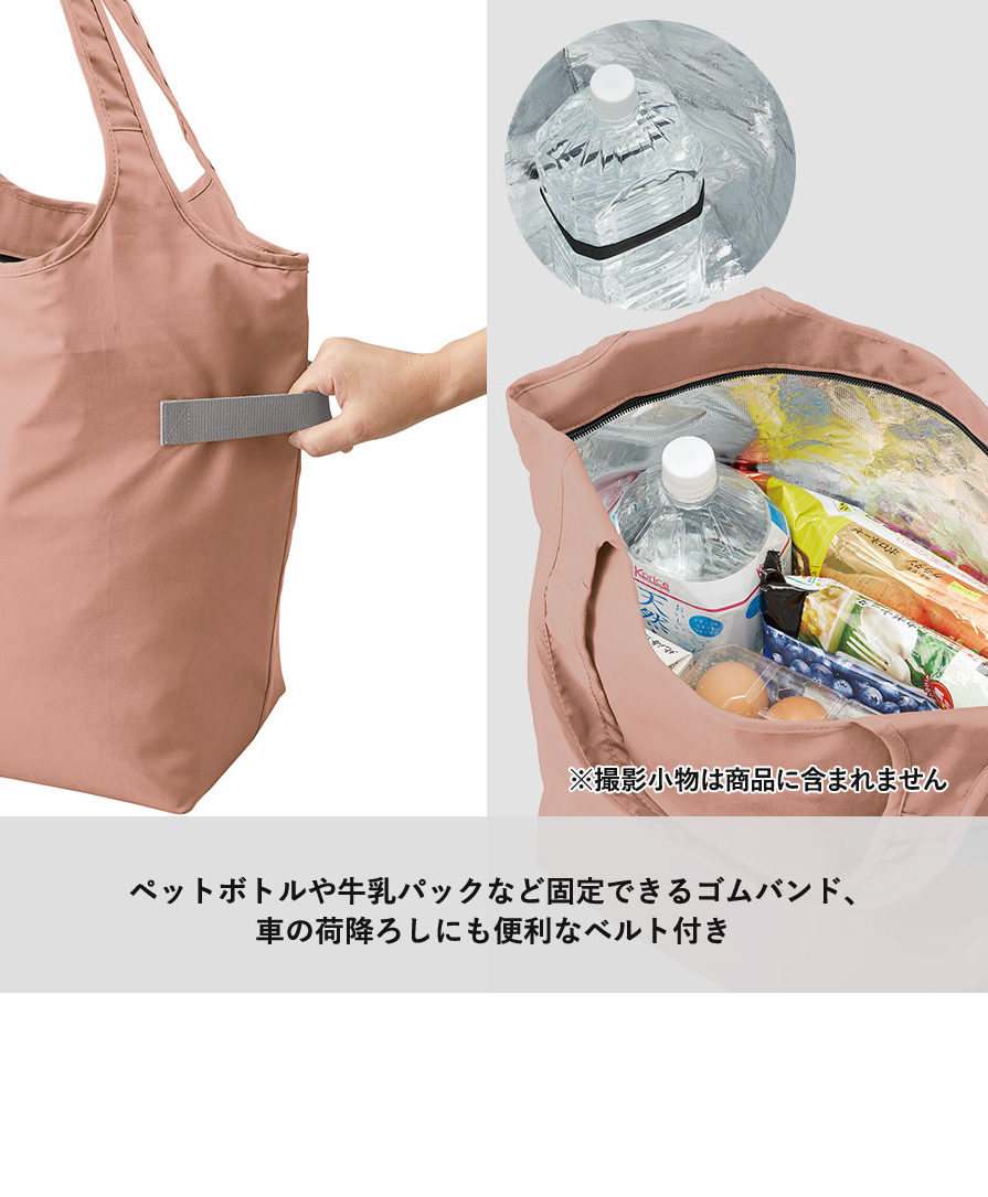 幅広のマチで物を入れるときも自立して入れやすく、内側には2Lペットボトルや牛乳パックが固定できるゴムバンド付き。袋口にはファスナー付きなので中身が飛び出す心配がなく、しっかり保冷でき安心です。また持ち手部分はクッション素材入りで手が痛くなりづらく、外側に付いたベルトは車からの荷降ろしや少し手を開けたい時に、傘等を引っ掛けることも出来ます。2020年度グッドデザイン賞受賞のハイセンスなデザインと、こだわりの機能満載のおしゃれなモッテルのエコバッグ。 ランチバッグ用や、お買い物用に便利に使えます。
