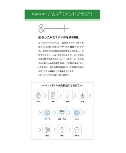 &+®とは 使用済みPETボトルを原料とした東レの新しいリサイクル繊維ブランドです。 環境への配慮と同時に、高品質高機能を両立した リサイクル繊維をつくりだします。 単なるリサイクルではない、「UPCYCLE」という考えのもと、 サステナブルな社会の実現のため、 リサイクル繊維市場のグローバルな拡大を目指します。
