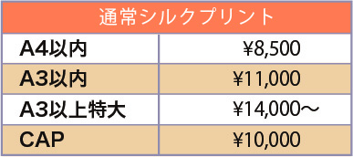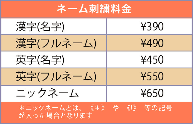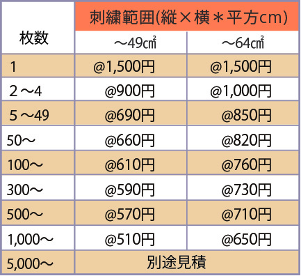 通常のシルクプリント、直刺繍やネーム刺繍の料金表です。