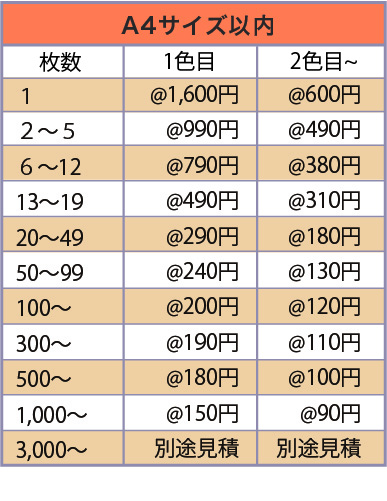 - 2色以上の多色プリントで, 色面積が小さくても全て全体サイズの製版代が掛かります。